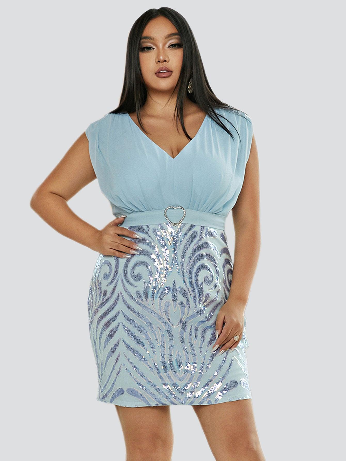 الفستان الصغير بالترتر الشيفون ذو الحجم الكبير مثالي لجميع أنواع الجسم. يتميز هذا الفستان القصير الأنيق بتصميم بوديكون شيفون أزرق مع أجزاء من الترتر. يتميز الفستان بقصة وتفاصيل من الترتر تضفي عليه مظهرا أنيقا من المؤكد أنه سيلفت الأنظار.