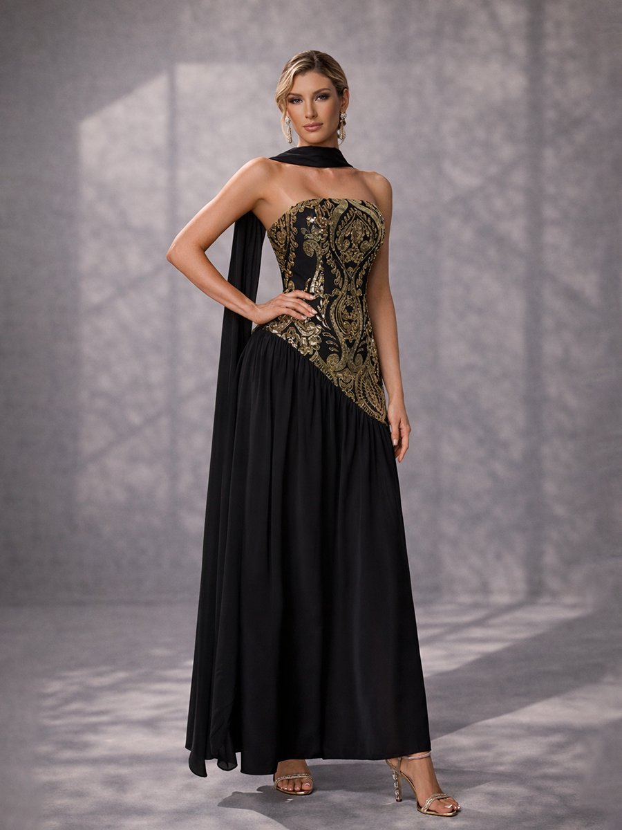 Black Gold Sequin Strapless Prom Dress with Scarf SL30237