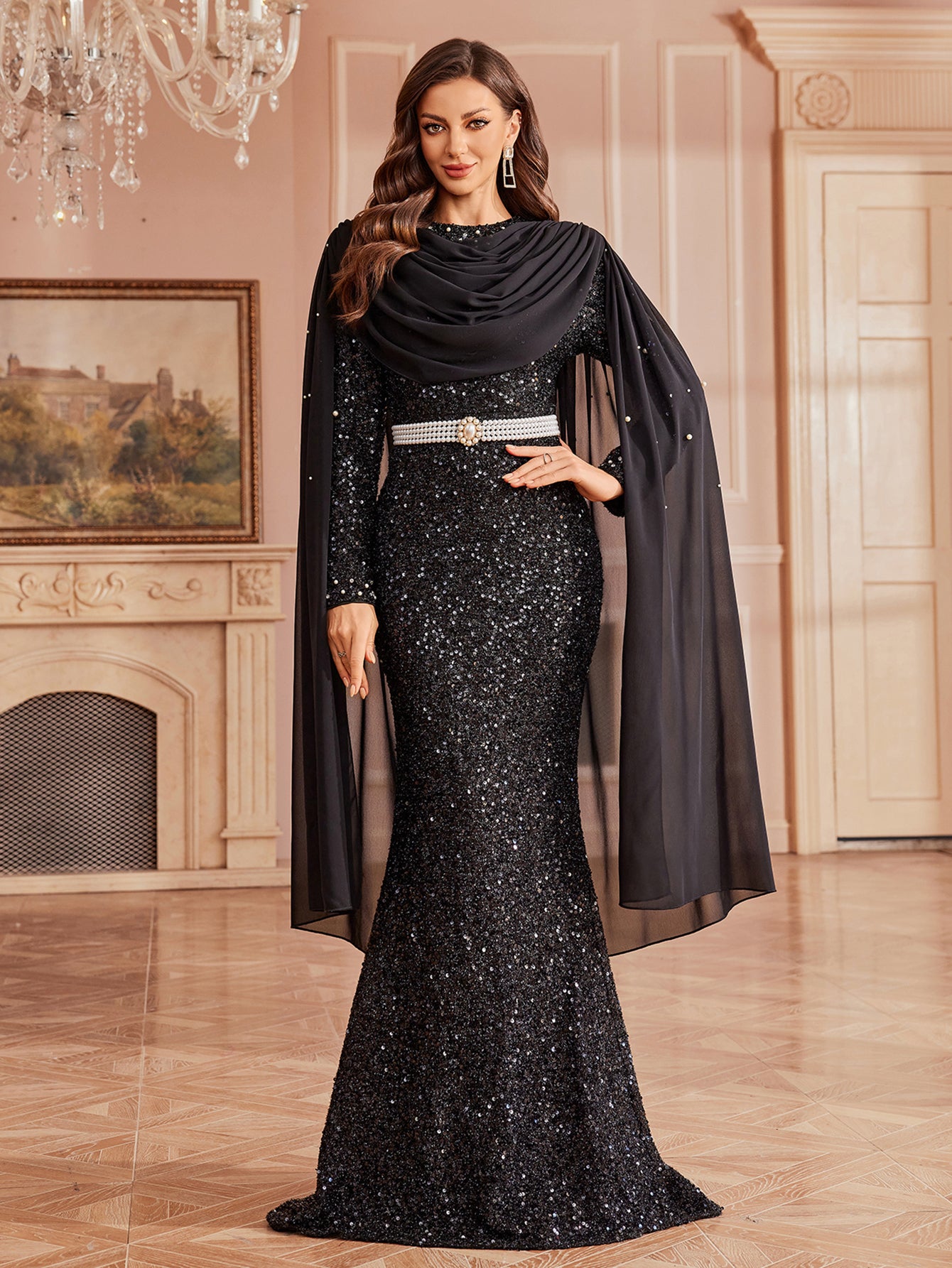Designed for showstopping formal events, this black gown features full-body sequin detailing, a draped sheer cape, long sleeves, and a pearl-adorned waist belt for dramatic, glamorous elegance. Perfect for galas, red-carpet occasions, and festive evening celebrations.