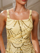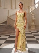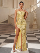 Shimmer into the spotlight in this stunning yellow sequin cocktail dress that's pure party magic. The ripple sequin detailing catches every light, while the daring split adds a flirty edge to your silhouette. Perfect for nights when you want to turn heads and feel absolutely fabulous. Whether it's cocktails with friends or a special celebration, this dress delivers glamour with a playful wink. Slip it on and let your confidence shine as bright as those sequins.