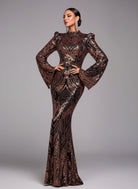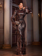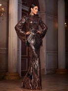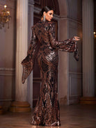 Elegant Turtleneck Padded Shoulder Trumpet Sleeve Sequin Evening Dress GM00971