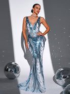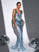 Glimmering like the ocean in this V-neck Sleeveless Mermaid Blue Sequin Formal Dress. This dress is the perfect combination of elegance and playfulness, perfect for a glamorous night out. The sequins catch the light, making you the star of the show. Don't be shy, have a little fun and shine bright!