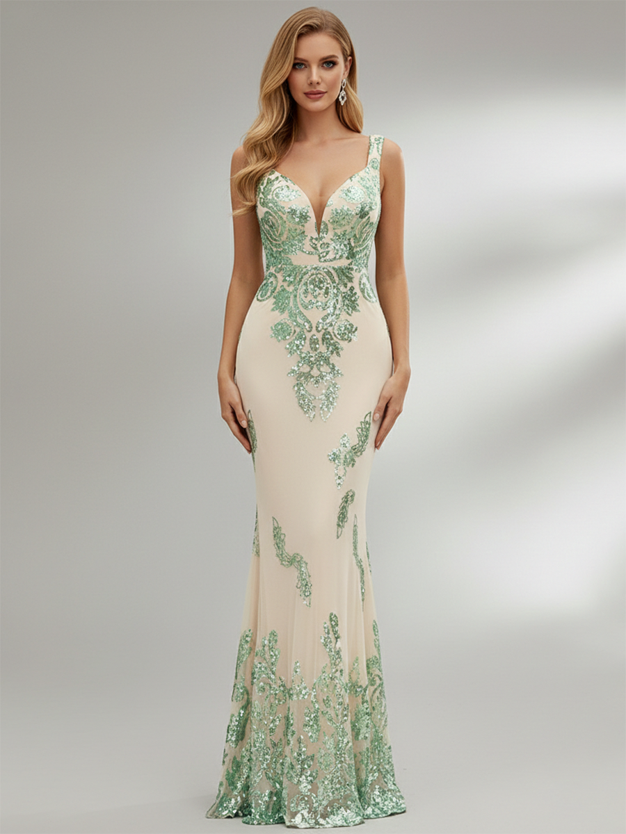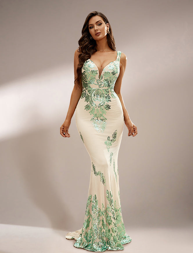 Stand out in this jaw-dropping V-neck Sleeveless Mermaid Sequin Gown Dress! With its stunning mermaid silhouette and sparkling sequins, this dress is perfect for any special occasion. Show off your unique sense of style and make a statement in this one-of-a-kind dress. (Mermaid shape accentuates curves + sequins catch the light)