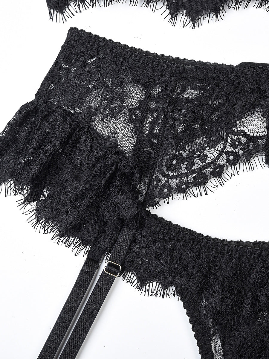Black Lace Embroidered Ruffled Cutout Sexy Set MSL096
