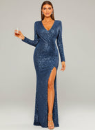 V Neck Long Split Sequin Blue Prom Dress XJ969