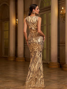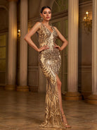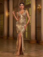 V Neck Split Mermaid Sequin Golden Evening Dress M01087
