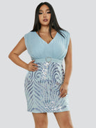 الفستان الصغير بالترتر الشيفون ذو الحجم الكبير مثالي لجميع أنواع الجسم. يتميز هذا الفستان القصير الأنيق بتصميم بوديكون شيفون أزرق مع أجزاء من الترتر. يتميز الفستان بقصة وتفاصيل من الترتر تضفي عليه مظهرا أنيقا من المؤكد أنه سيلفت الأنظار.