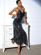 - Detail: Asymmetric hem, Spaghetti, Backless, Sequin Pattern
