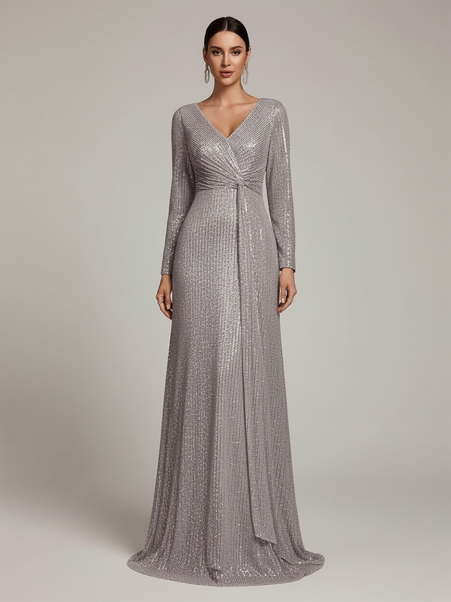 Long Sleeve Knot A-line Sequin Prom Dress GM01058