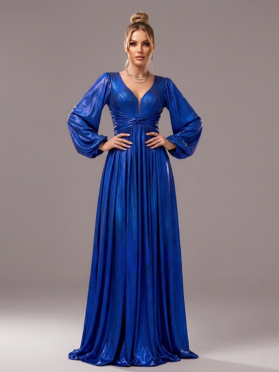 Blue V-neck Long Sleeve A-line Prom Dress DH80273