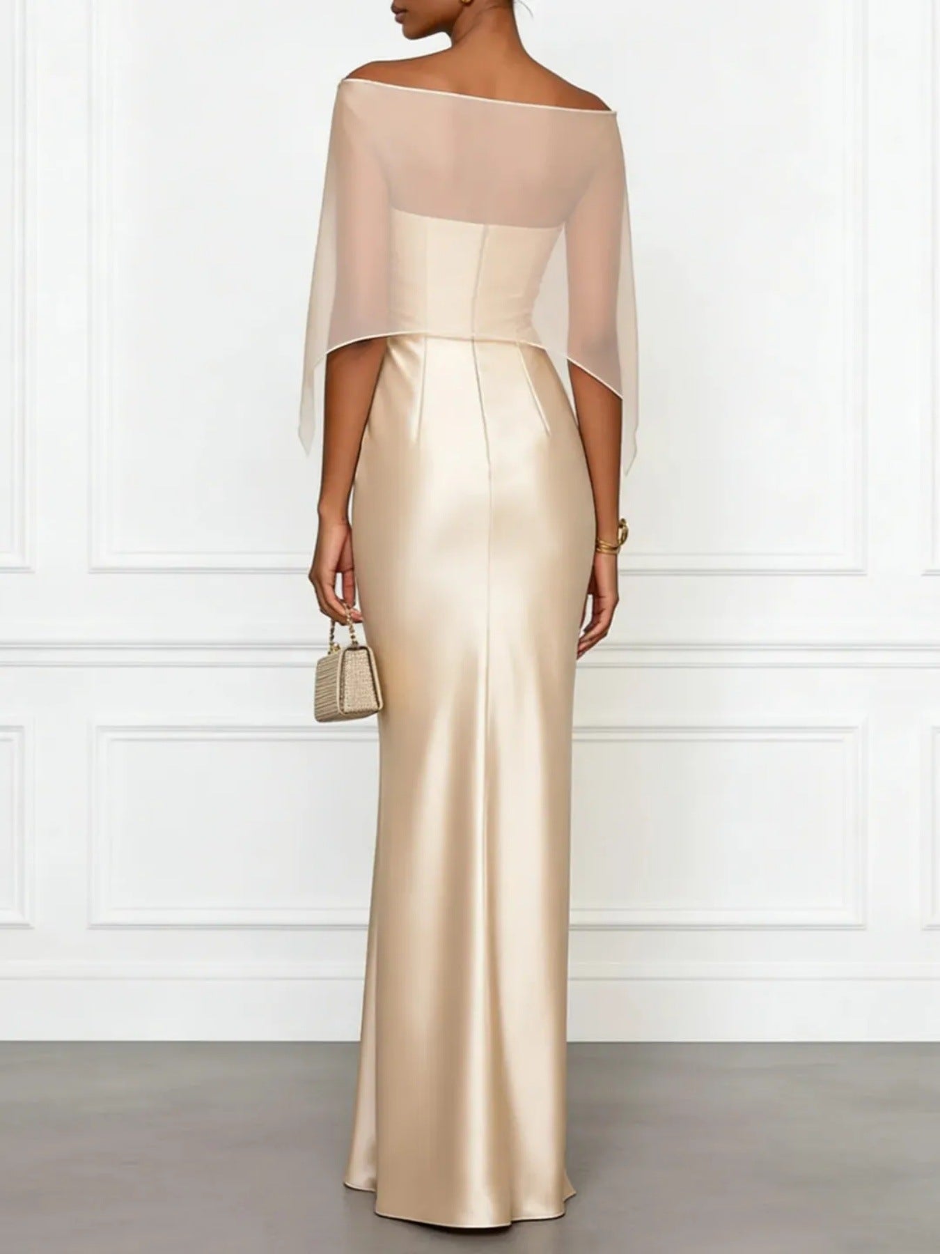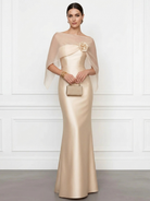 Channel timeless sophistication with this luxurious champagne maxi gown. It features a fitted satin mermaid silhouette, an elegant off-the-shoulder sheer capelet overlay, and a delicate floral brooch accent, creating a refined, formal look perfect for mother-of-the-bride occasions, black-tie galas, and upscale evening events.