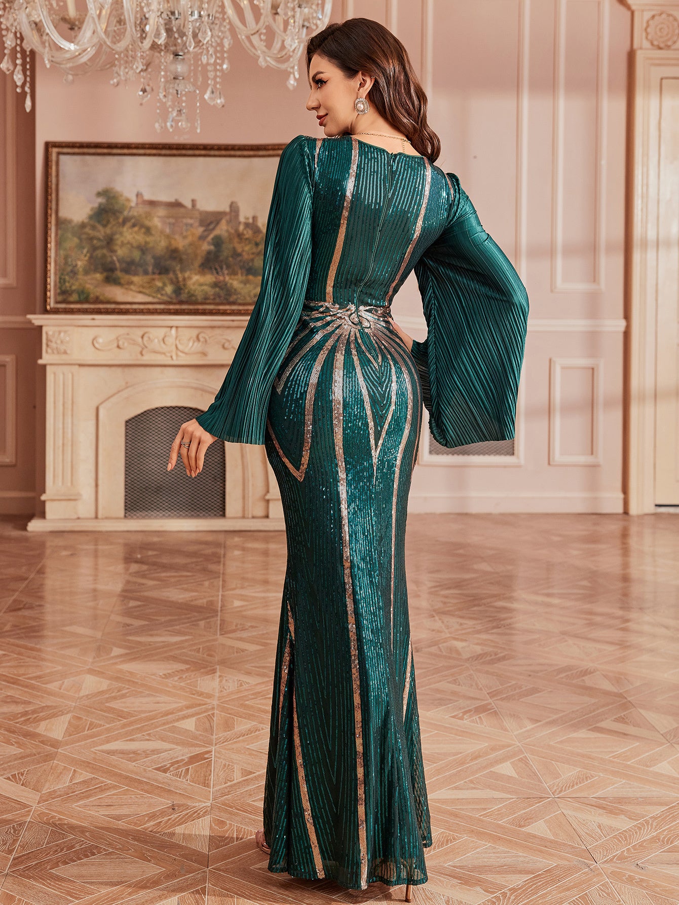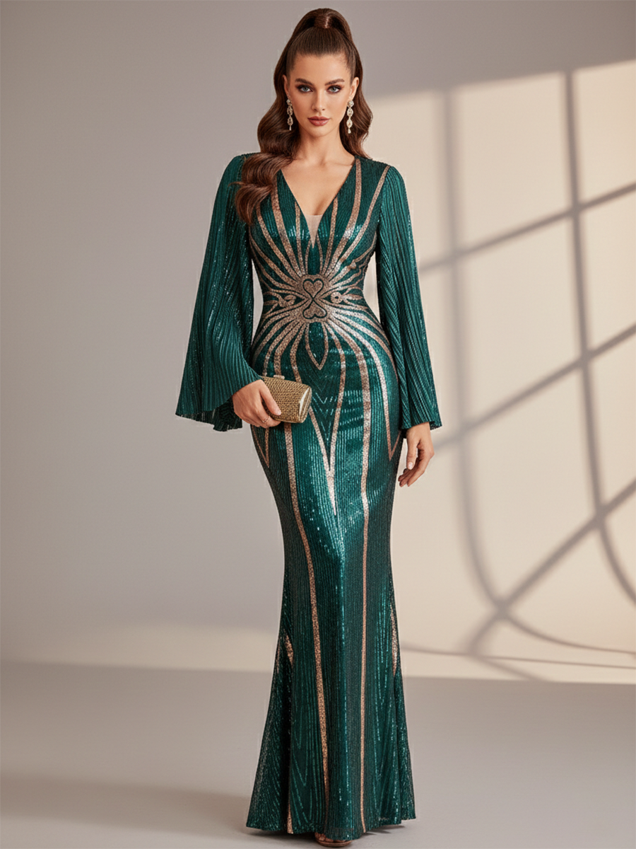 Designed for opulent formal events, this emerald gown features all-over sequins, gold Art Deco detailing, a deep V-neck, and dramatic bell sleeves for vintage-glam allure. Perfect for galas, weddings, and statement-making evening occasions.