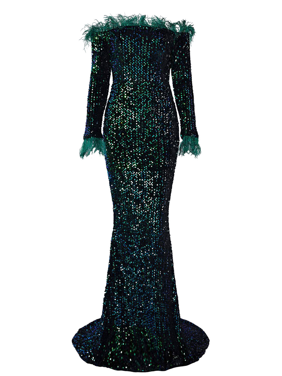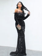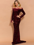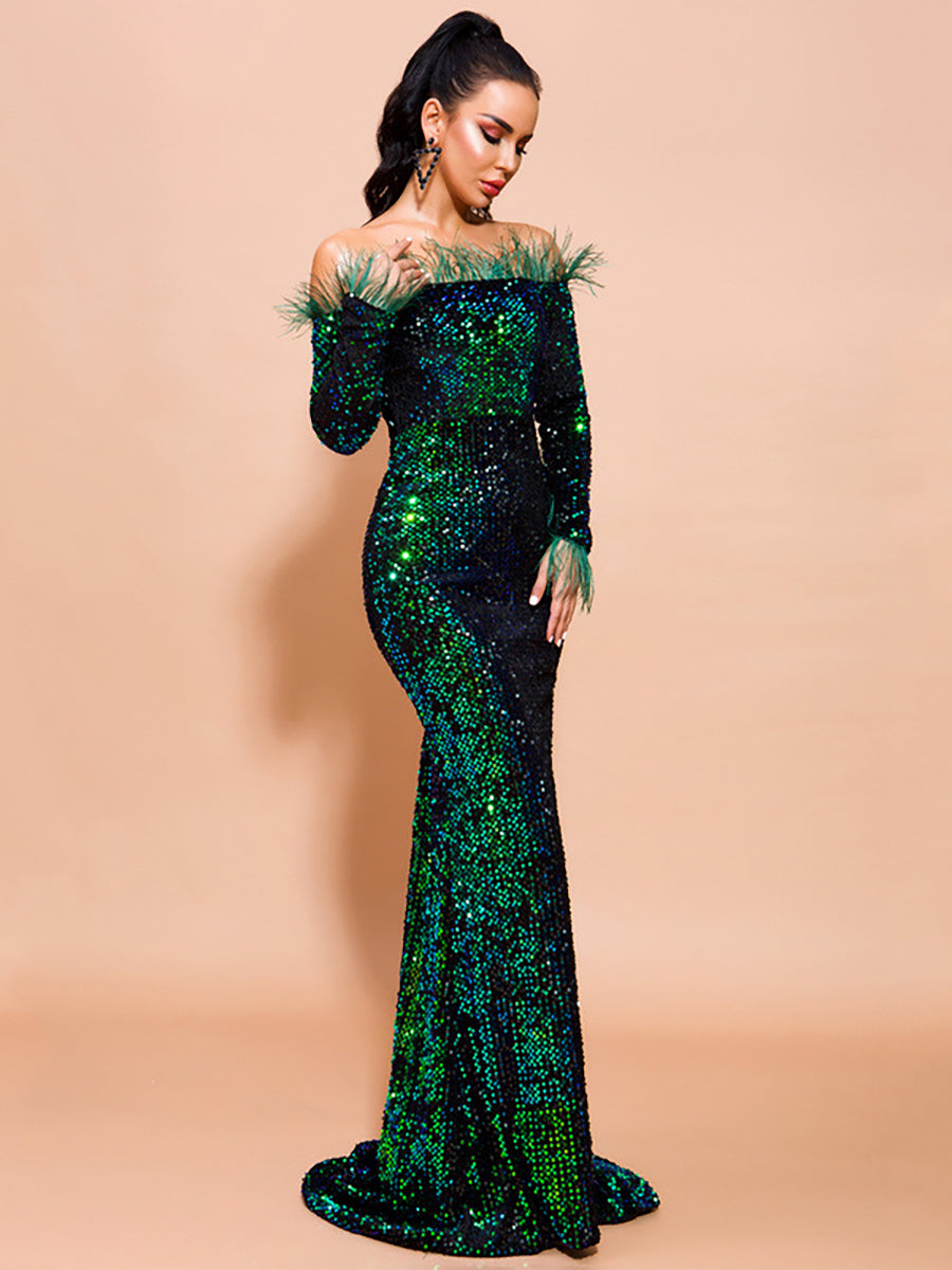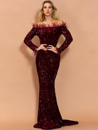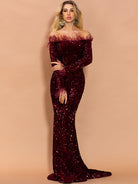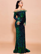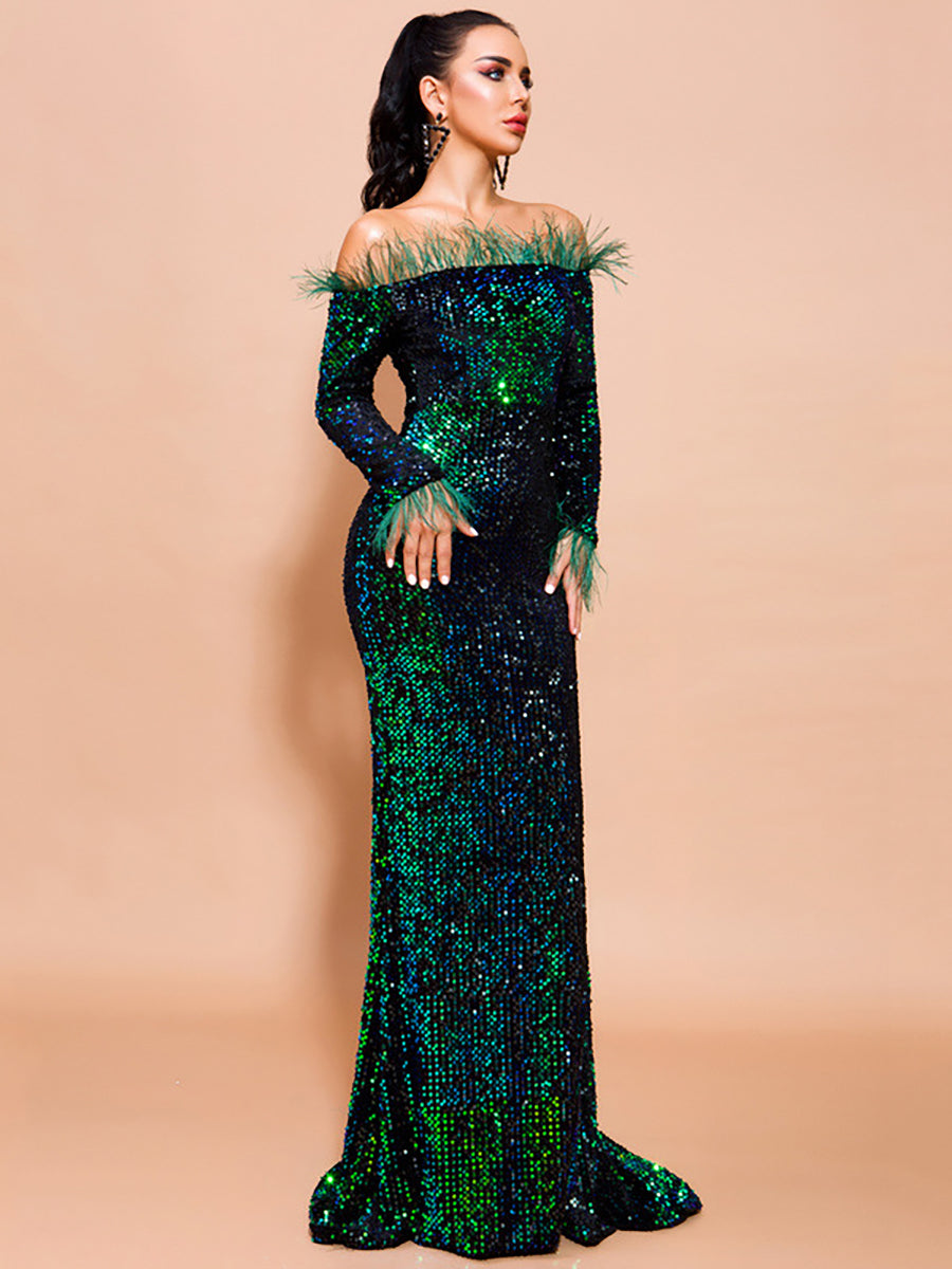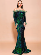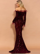 Off Shoulder Feather Sequin Evening Dress FT19005