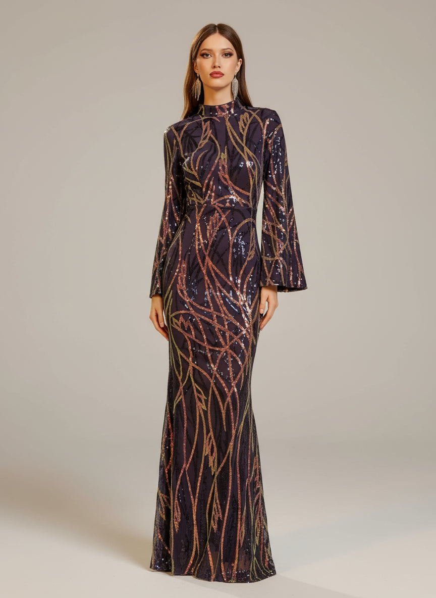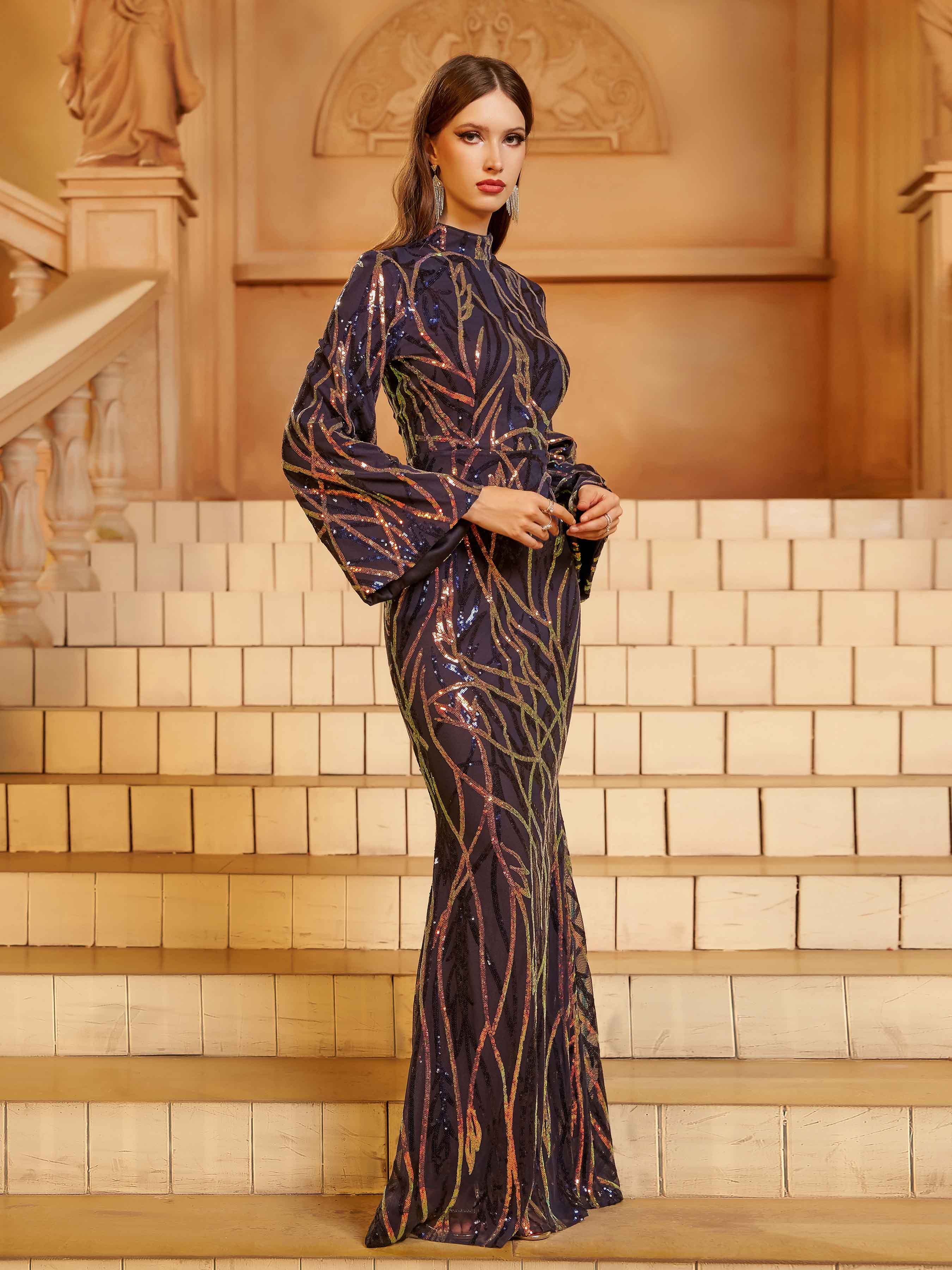 Blue Sequin Graphic Long Sleeve Prom Dress DH80462
