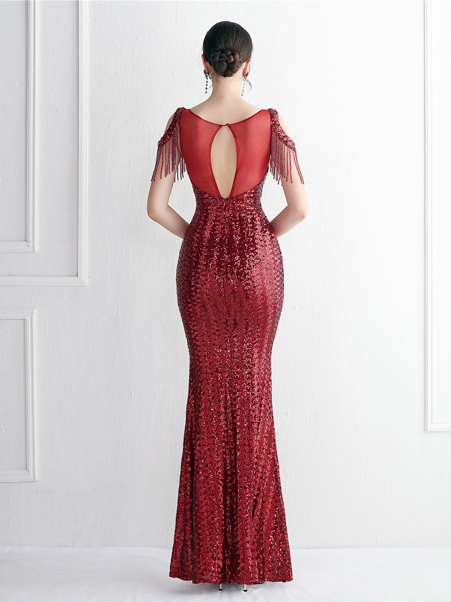 Burgundy Sequin Chain Sleeve V-Neck Formal Dress XFR51023