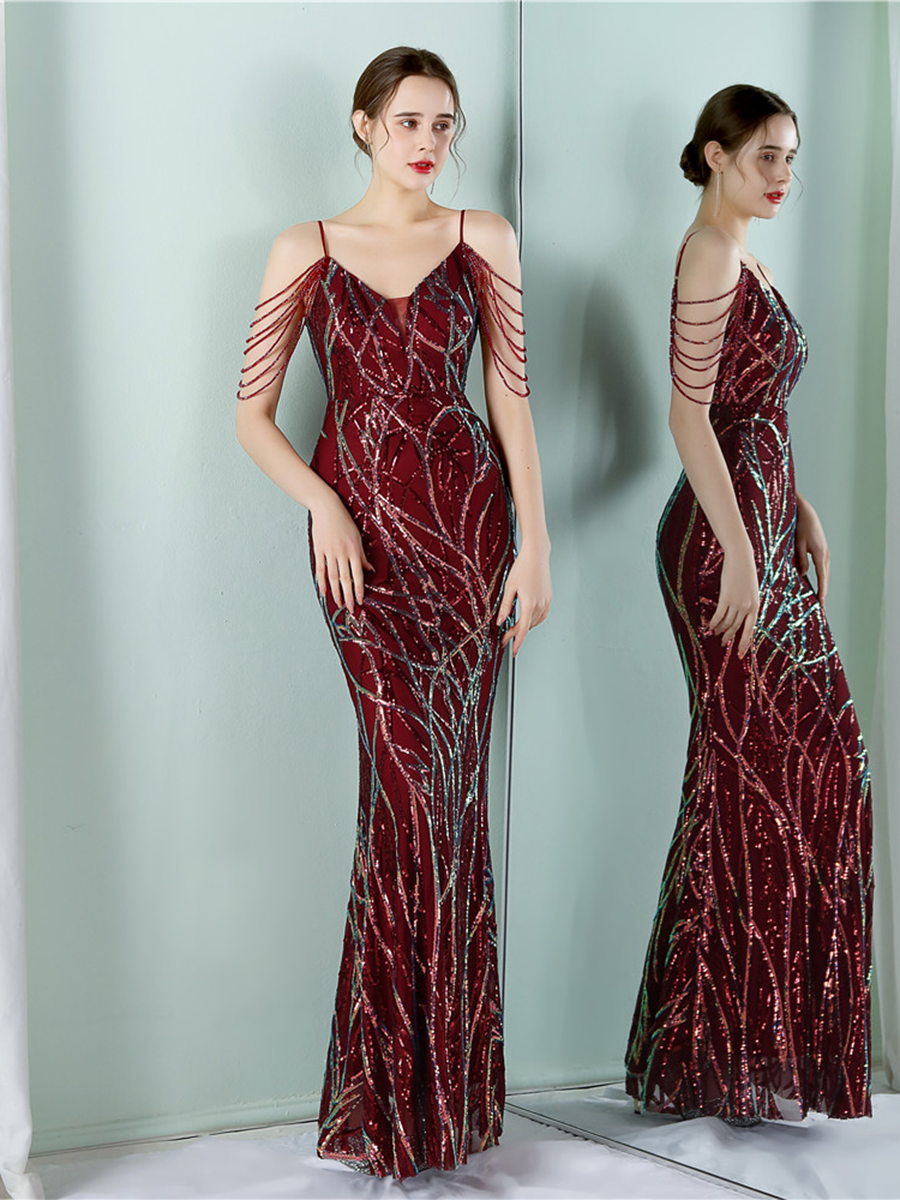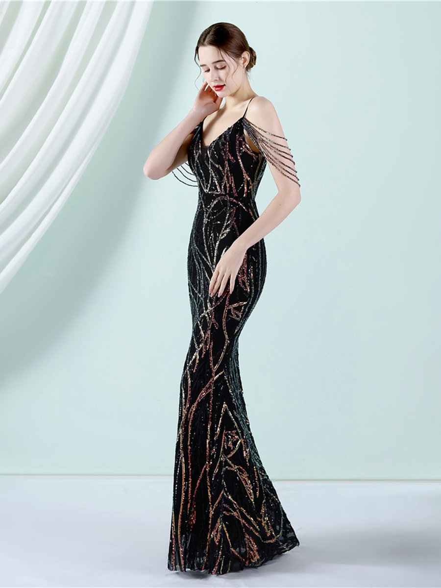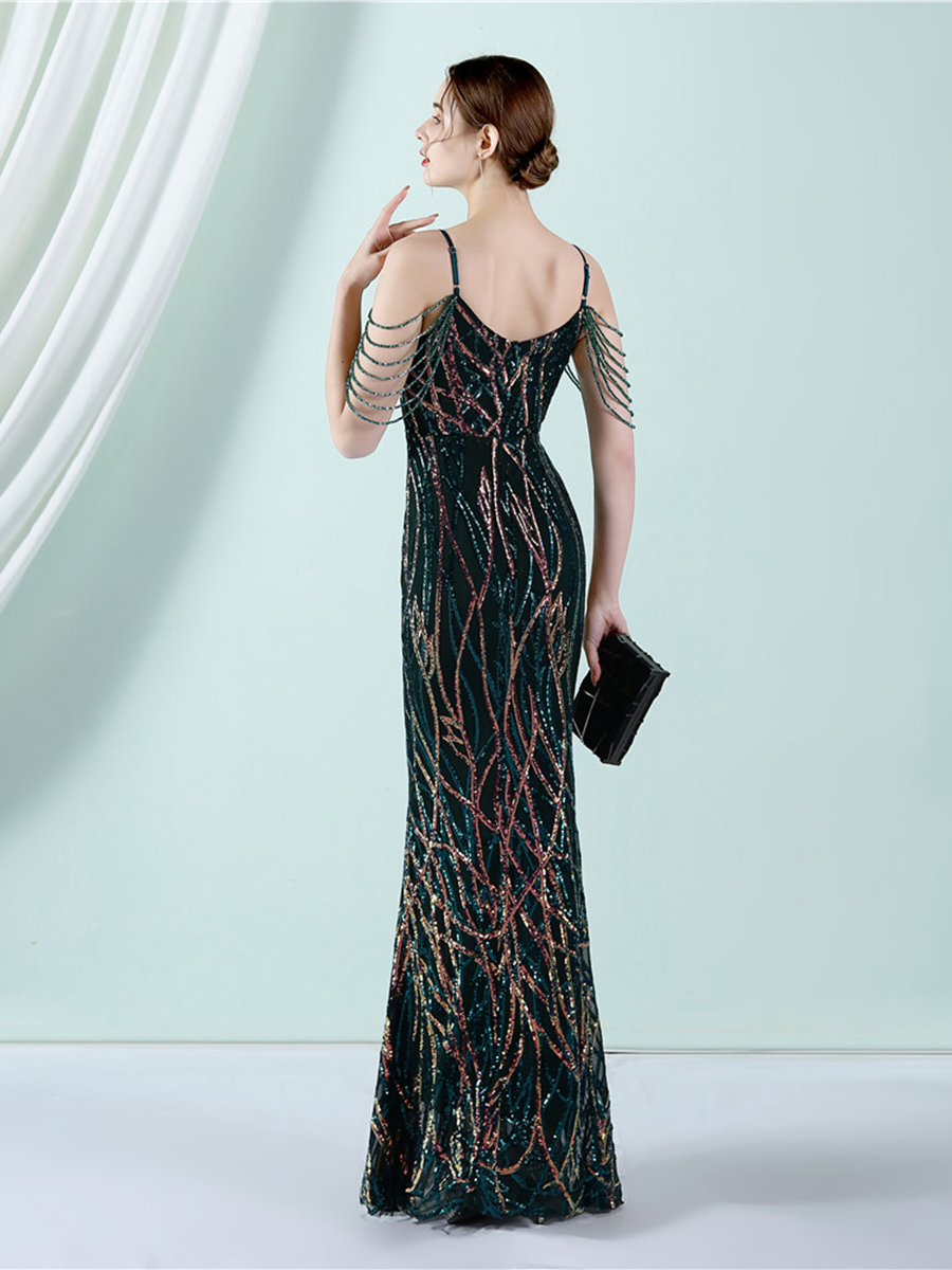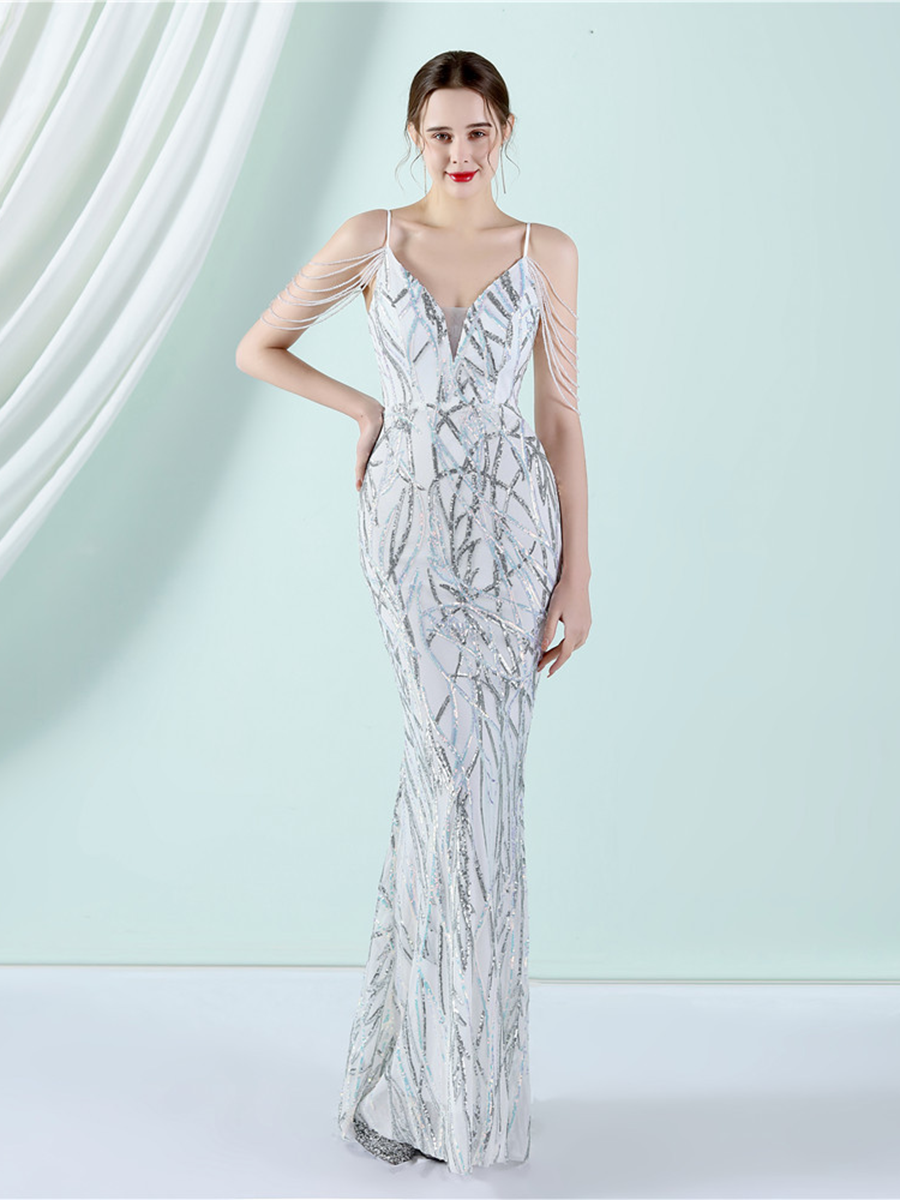 Elegant V-Neck Beads Chain Sequin Mermaid Formal Dress M02088