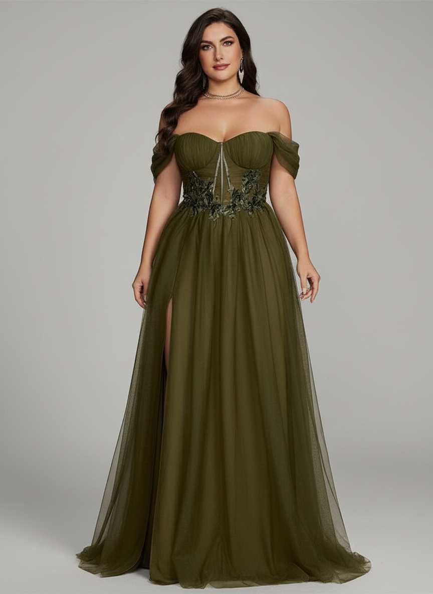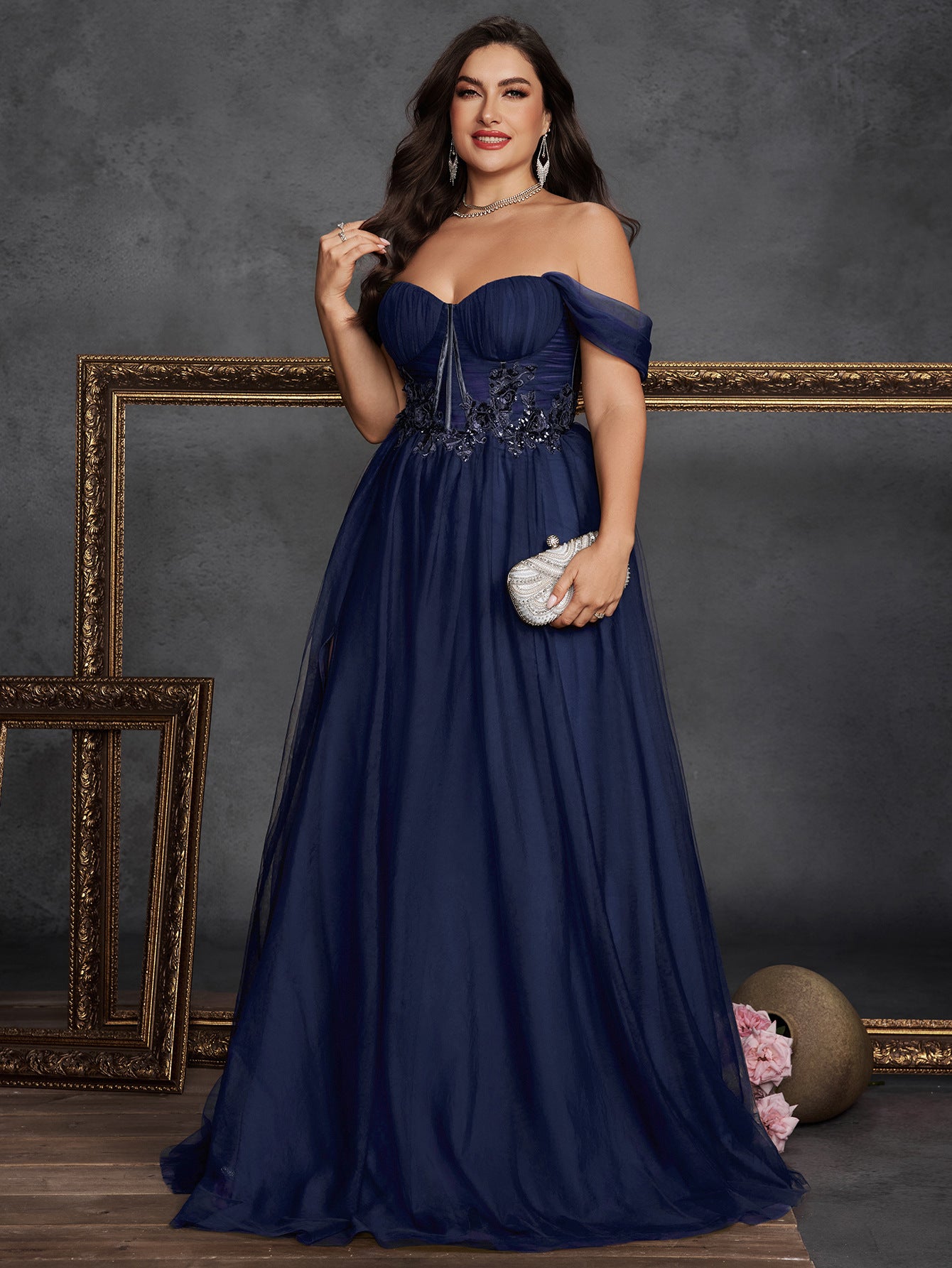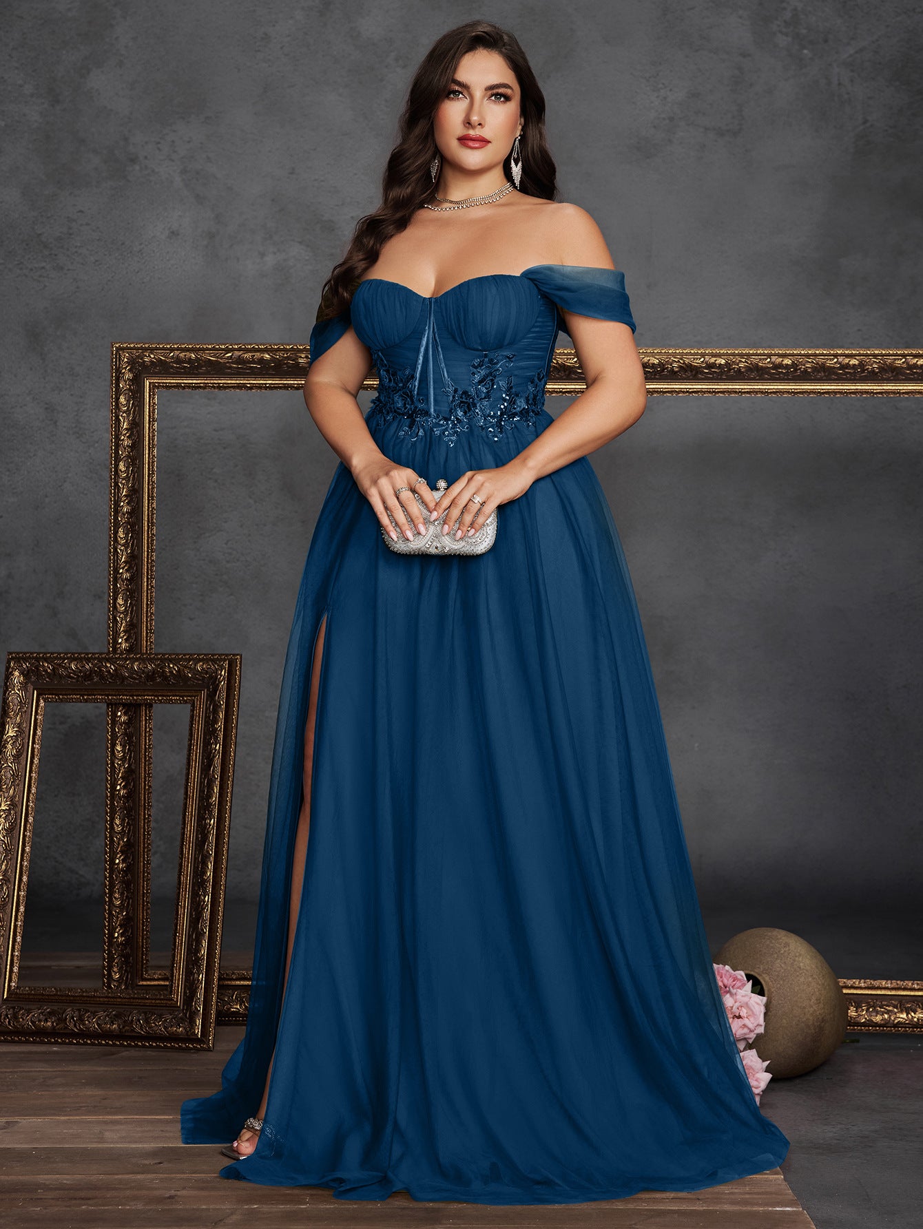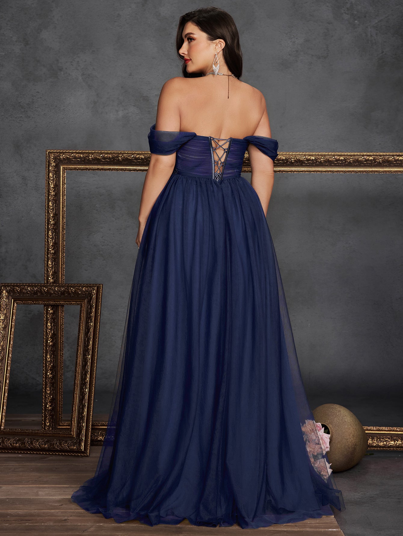Plus Off Shoulder Corset Lace Panel Prom Dress PRH30619
