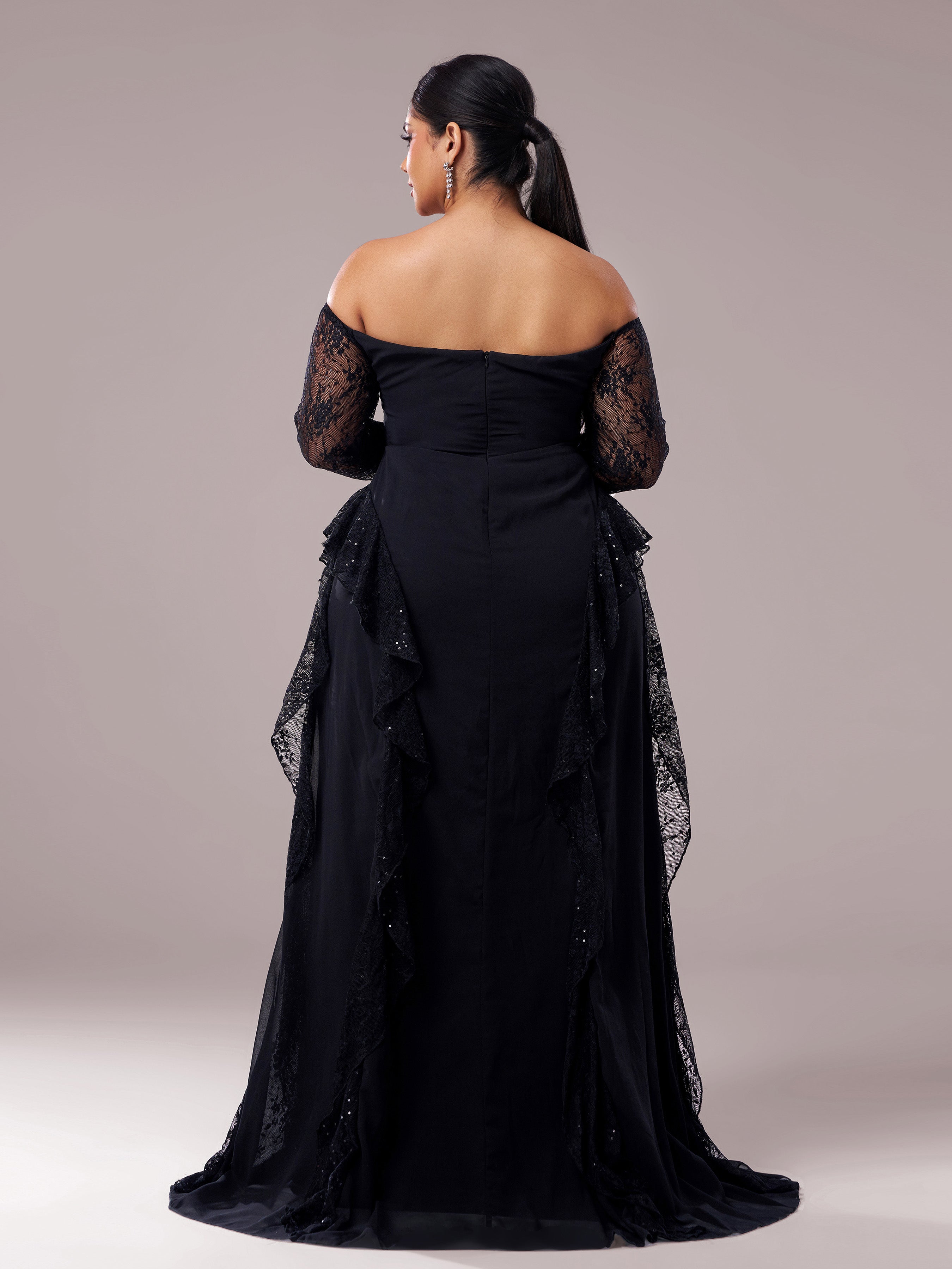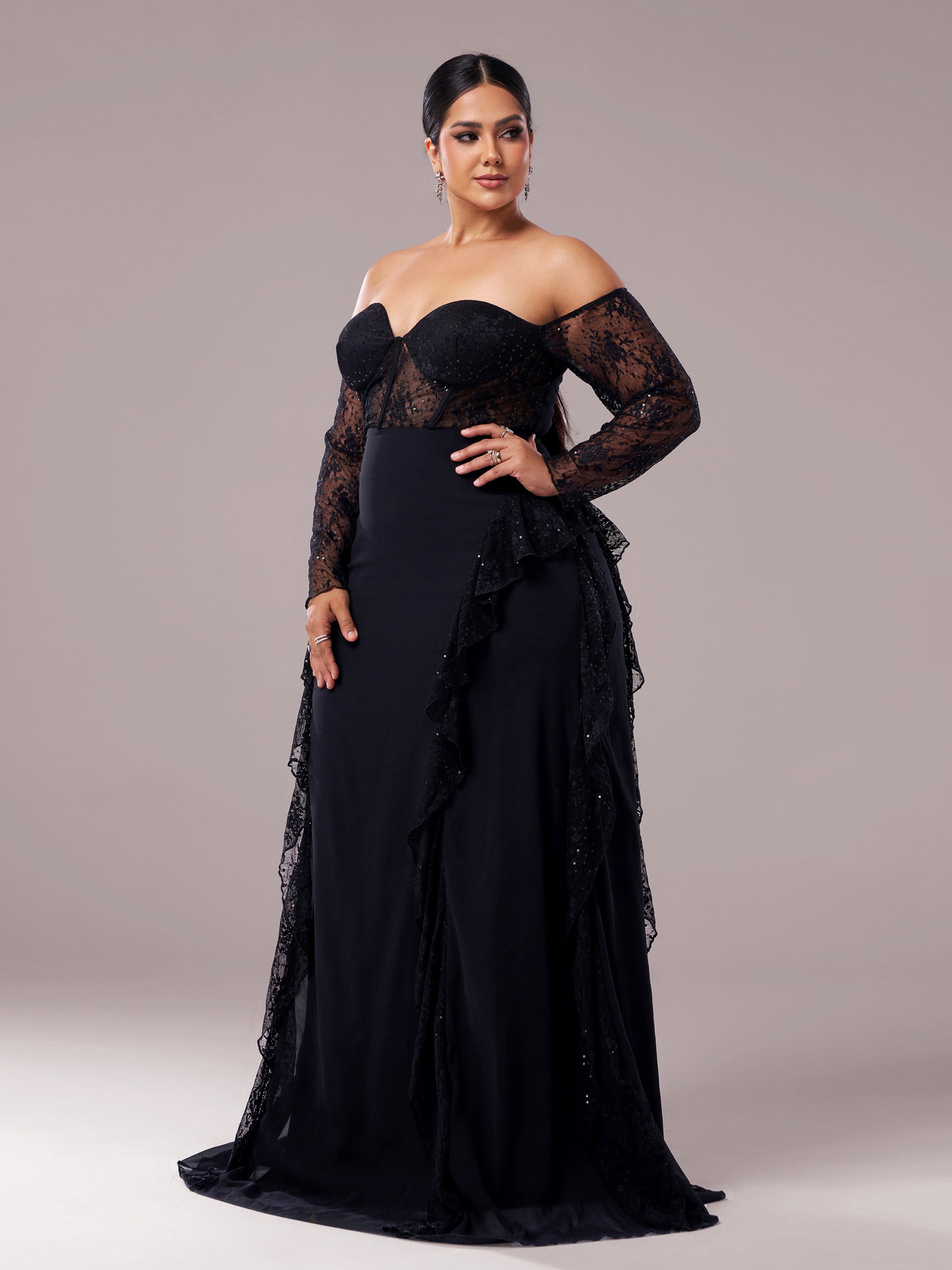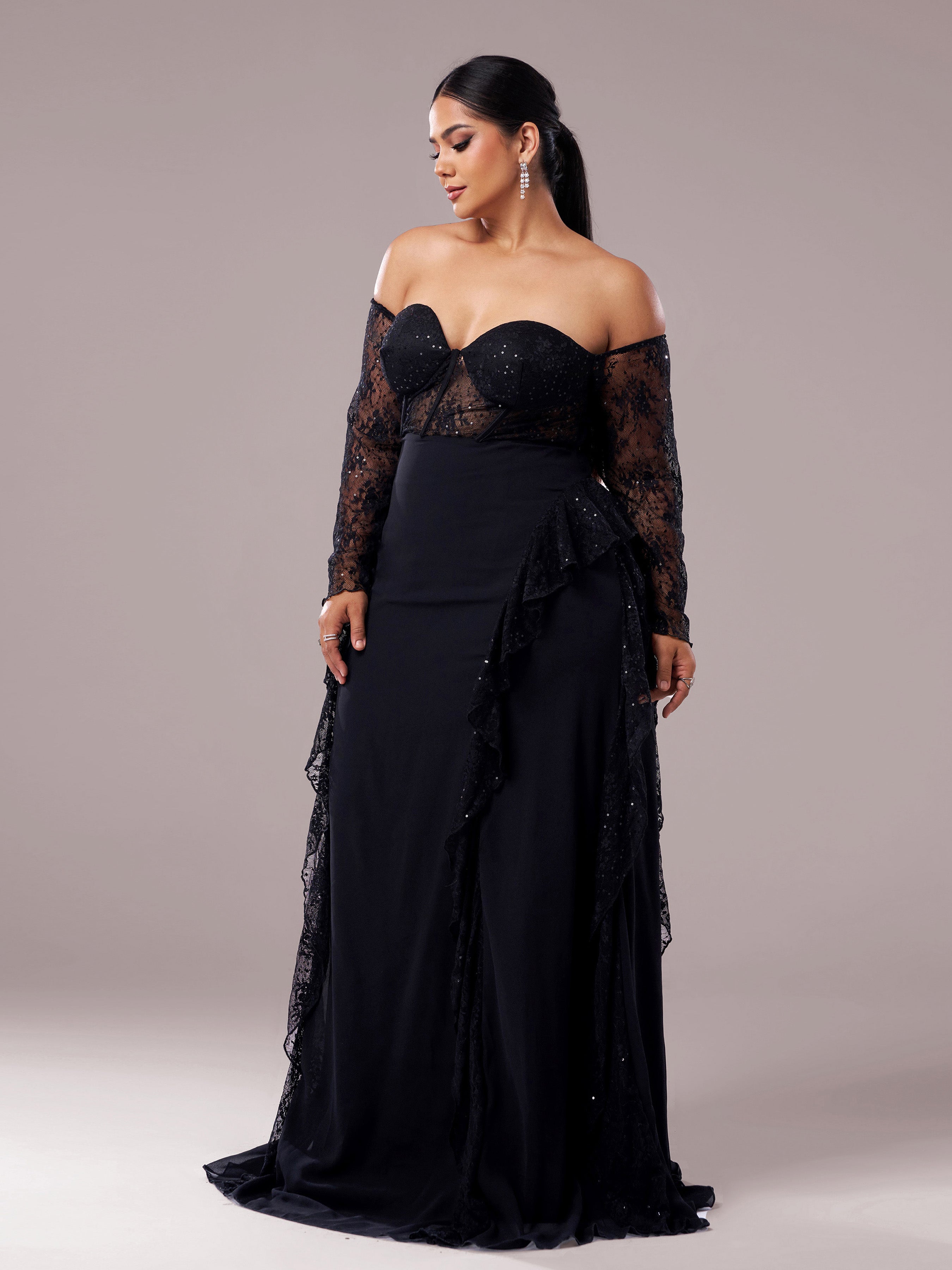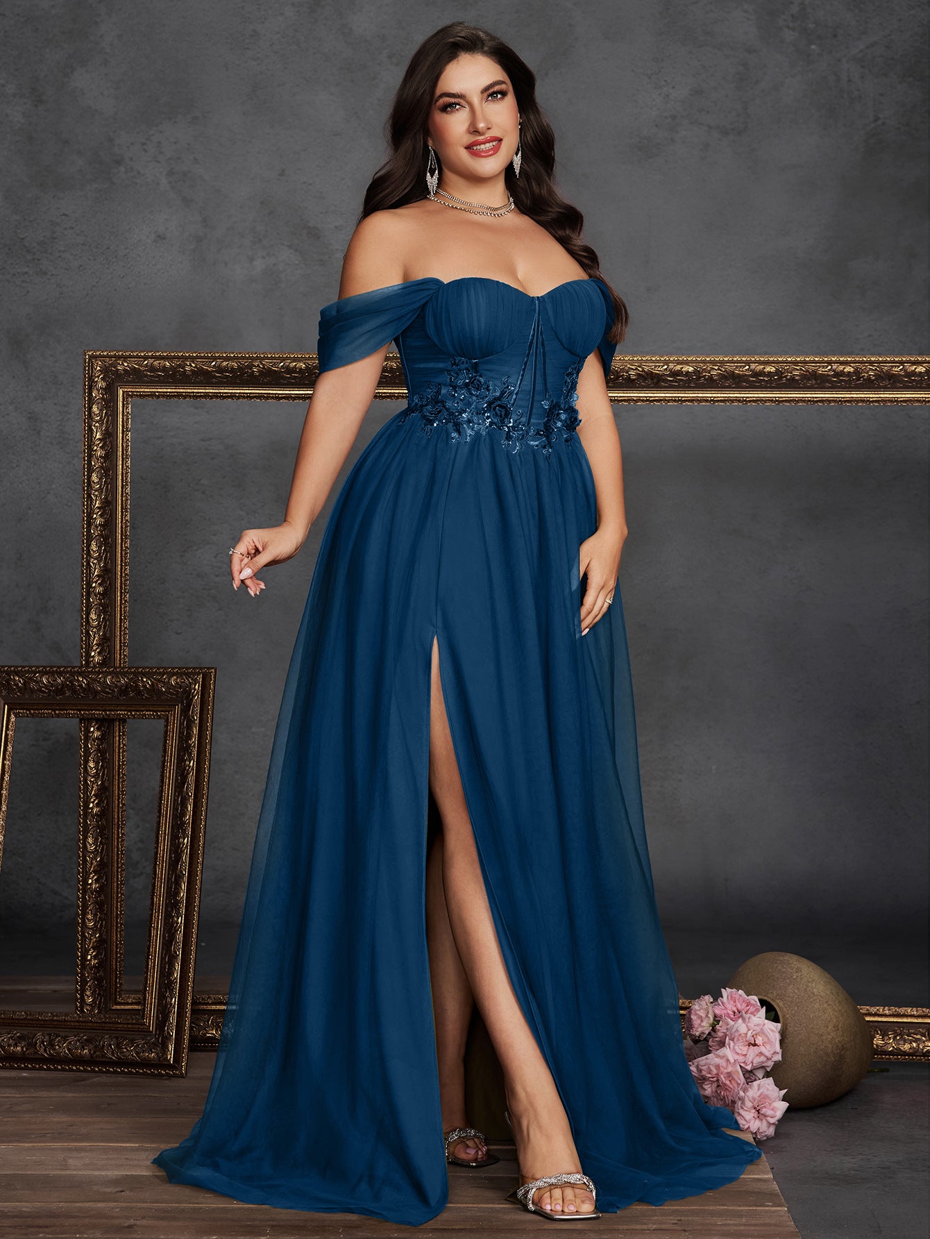 Plus Off Shoulder Corset Lace Panel Prom Dress PRH30619