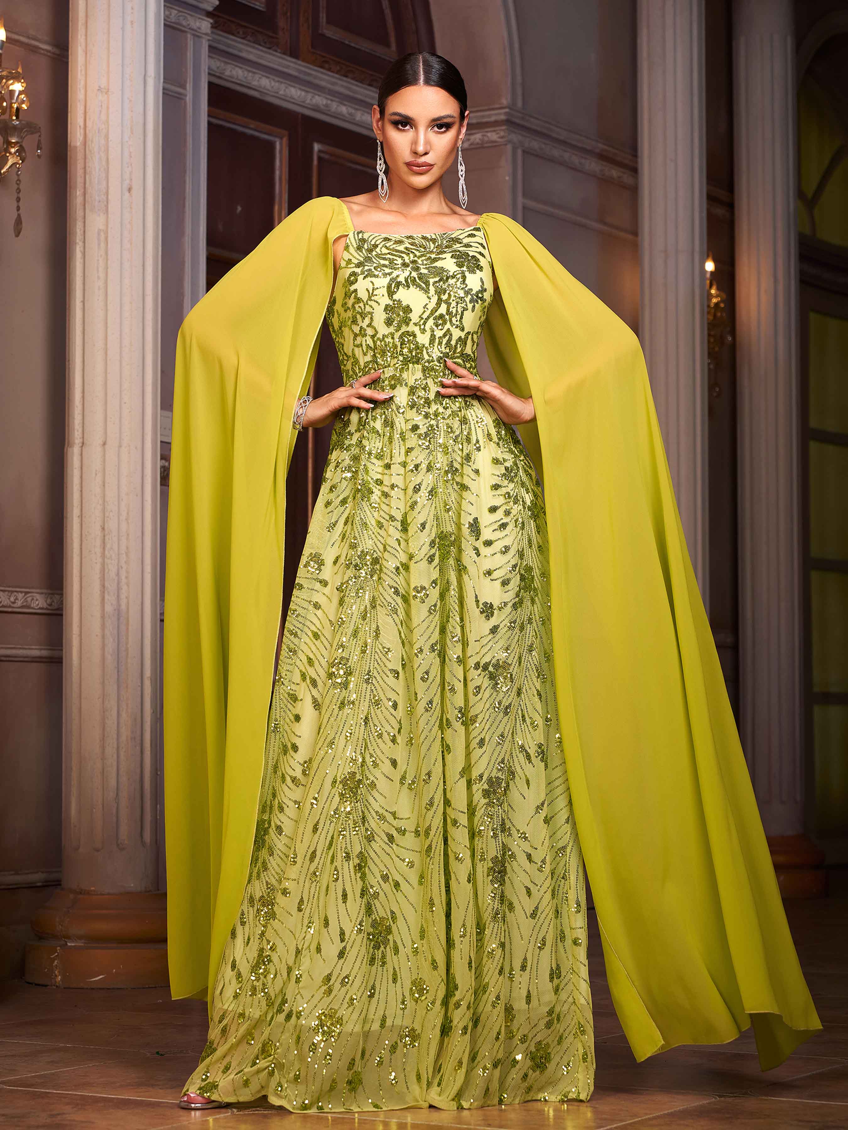 Green Floral Sequin Cape Sleeve Prom Dress GM01067