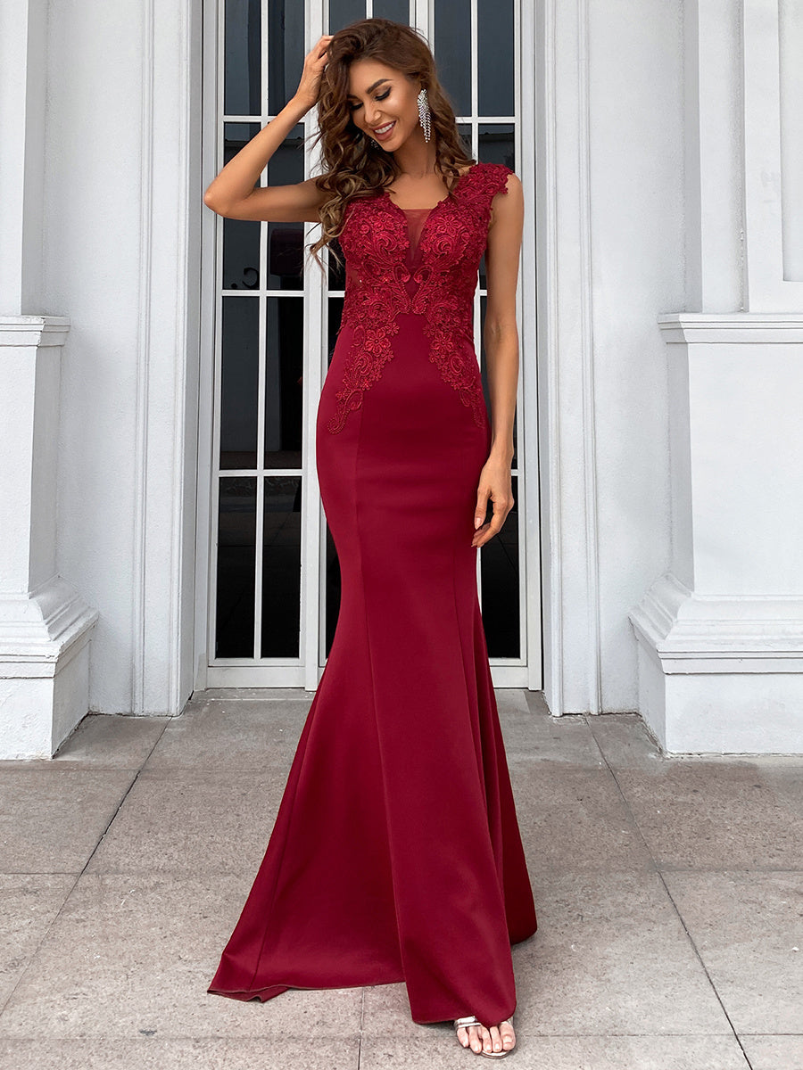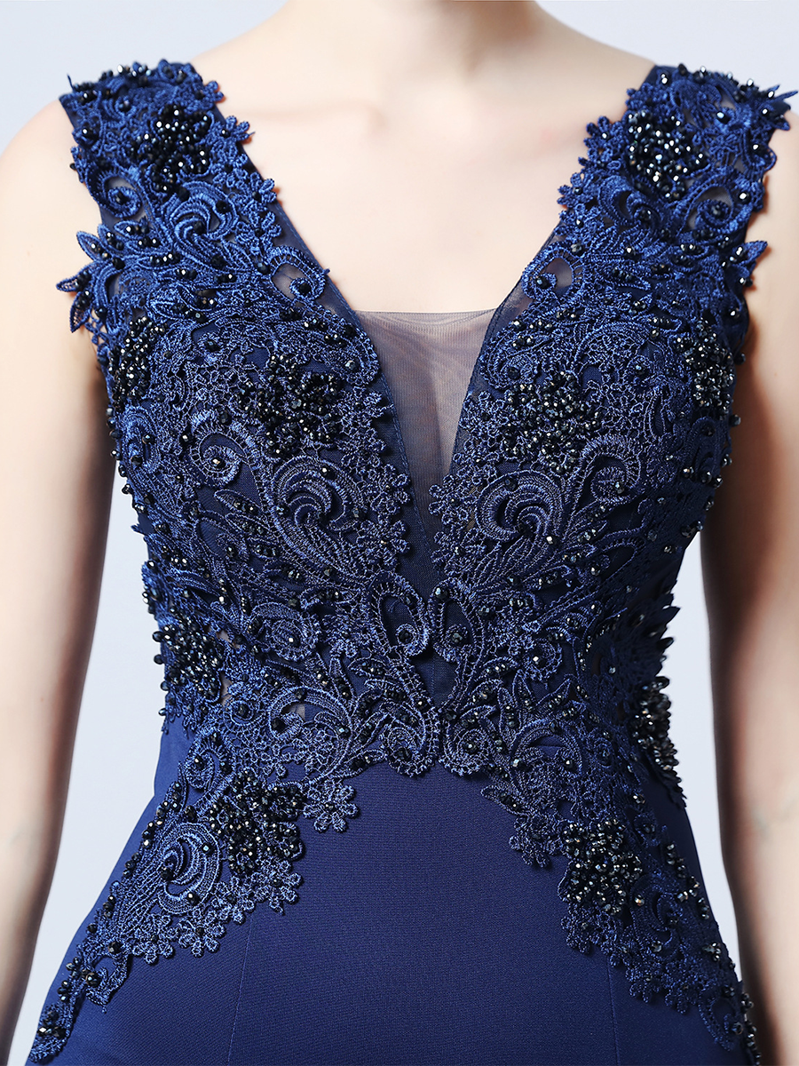 Elegant V-Neck Embroidered Applique Mermaid Evening Gown M0162