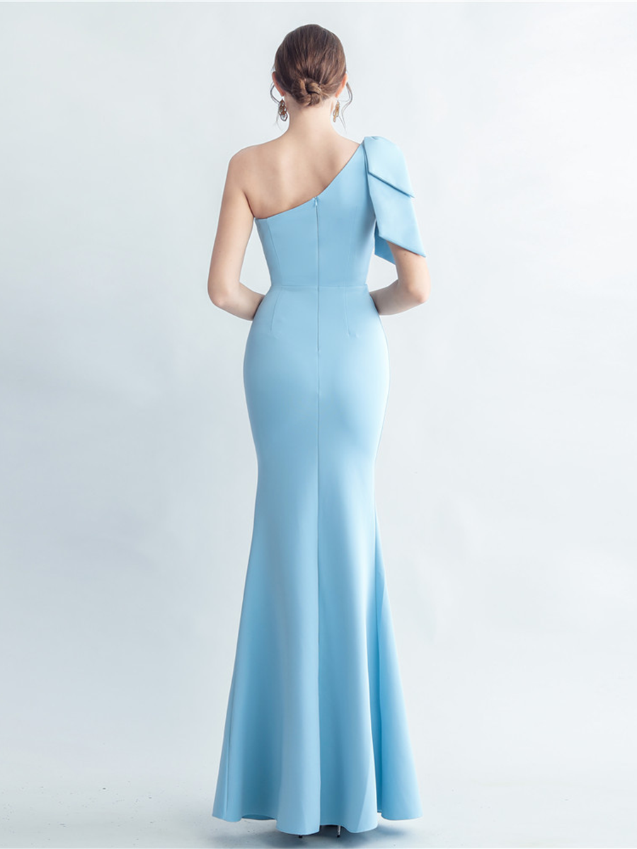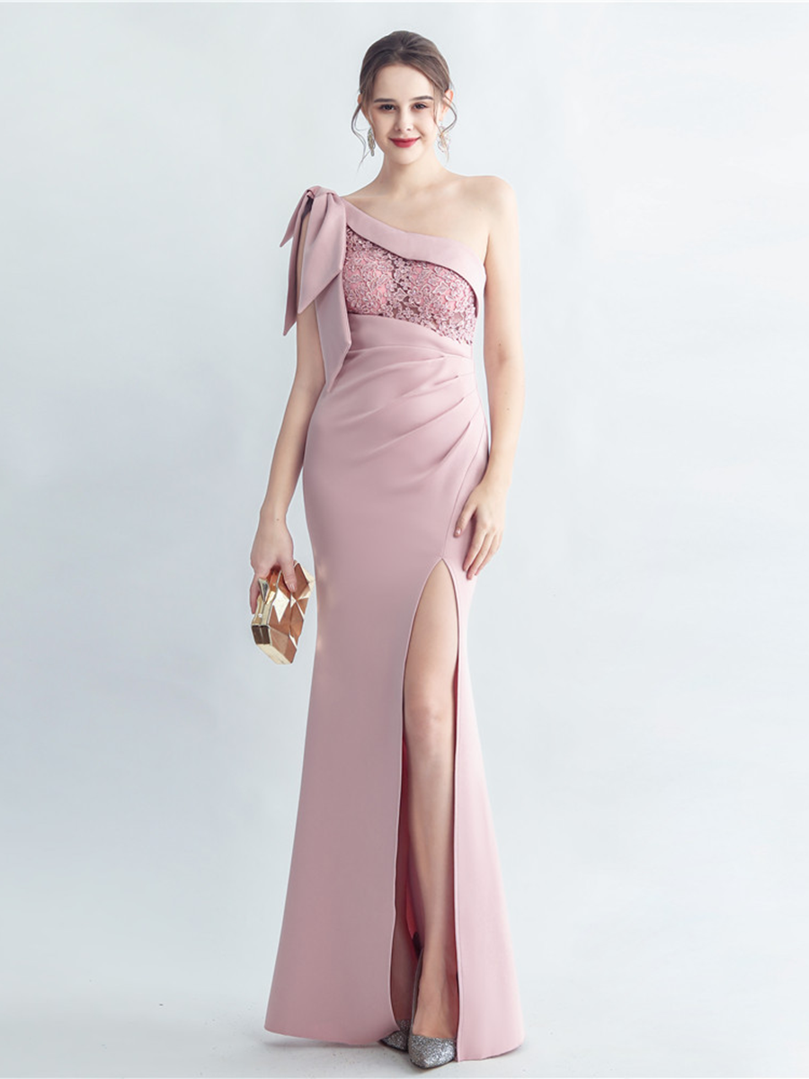 One-Shoulder Bowknot Lace Panel High Slit Evening Gown M03223