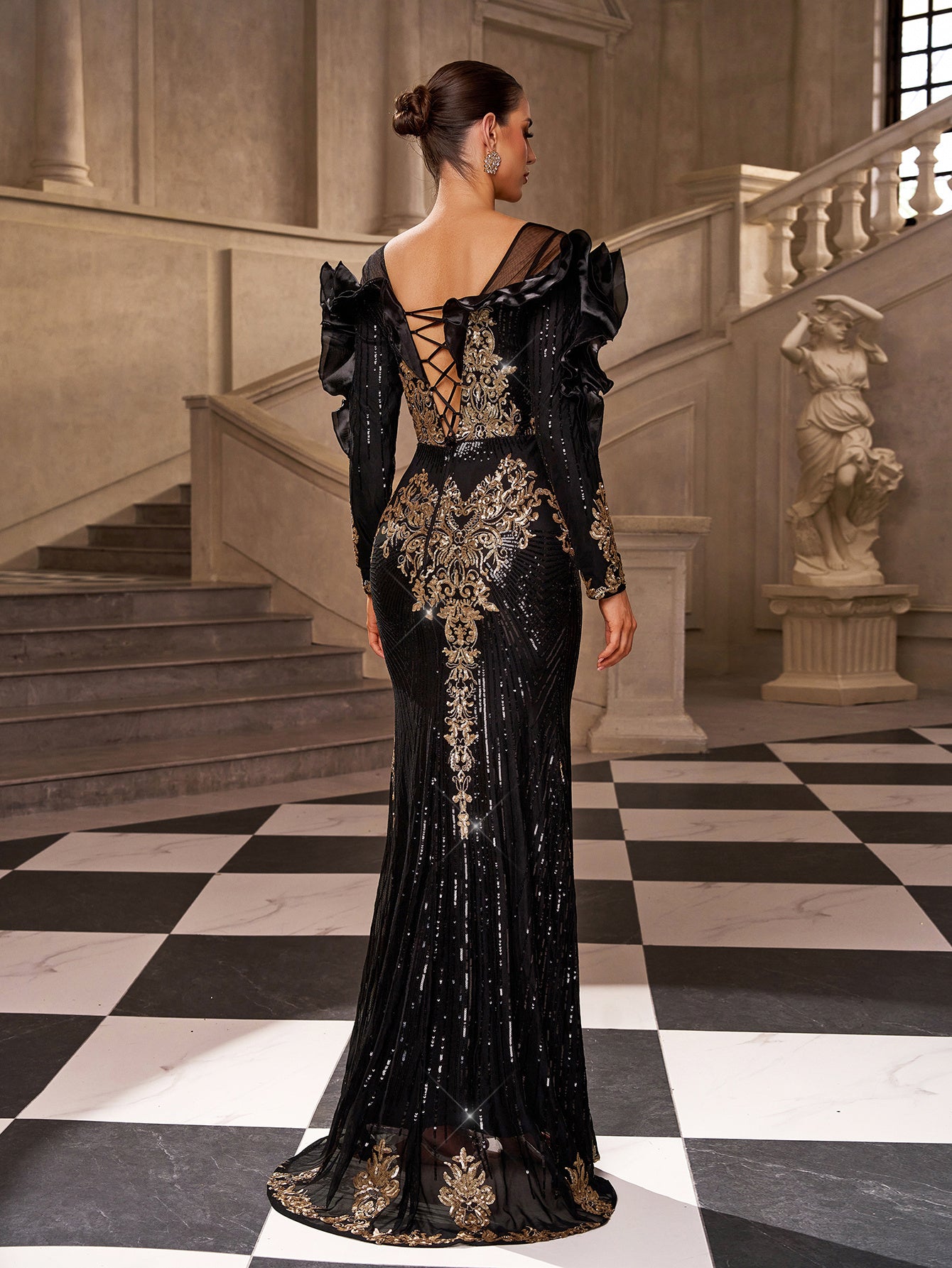 Black Geometric Sequin Bell Sleeve Evening Dress GM010124