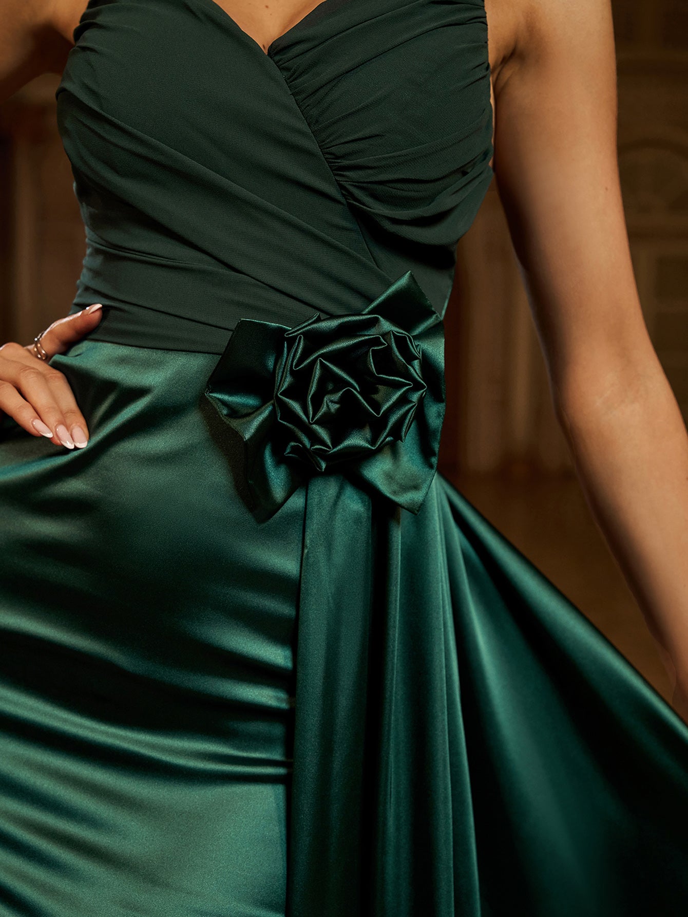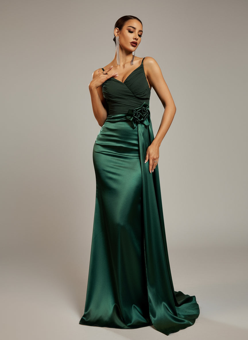 Green Floral Draped Satin Backless Prom Dress GM00798