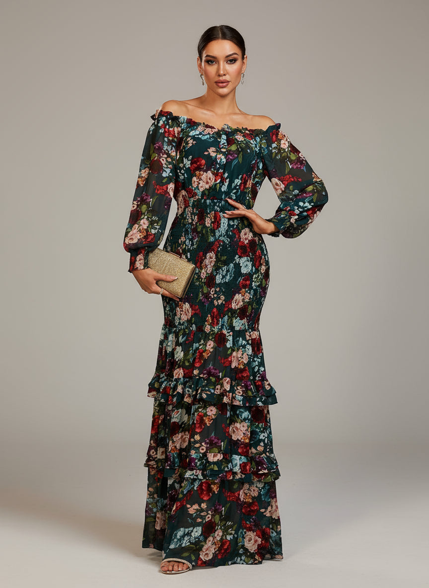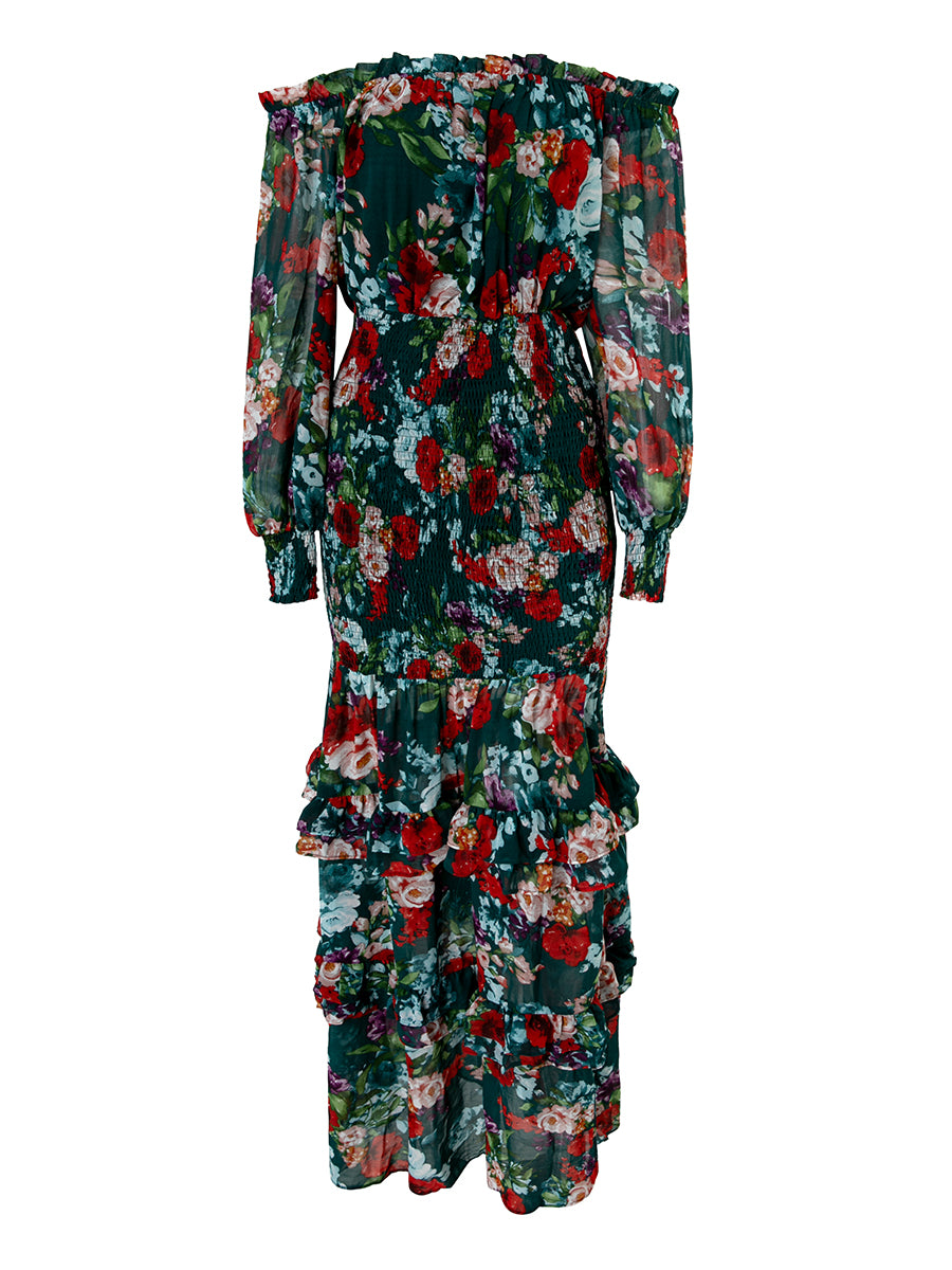 Ruffled Green Printed Casual Chiffon Dress XH1647