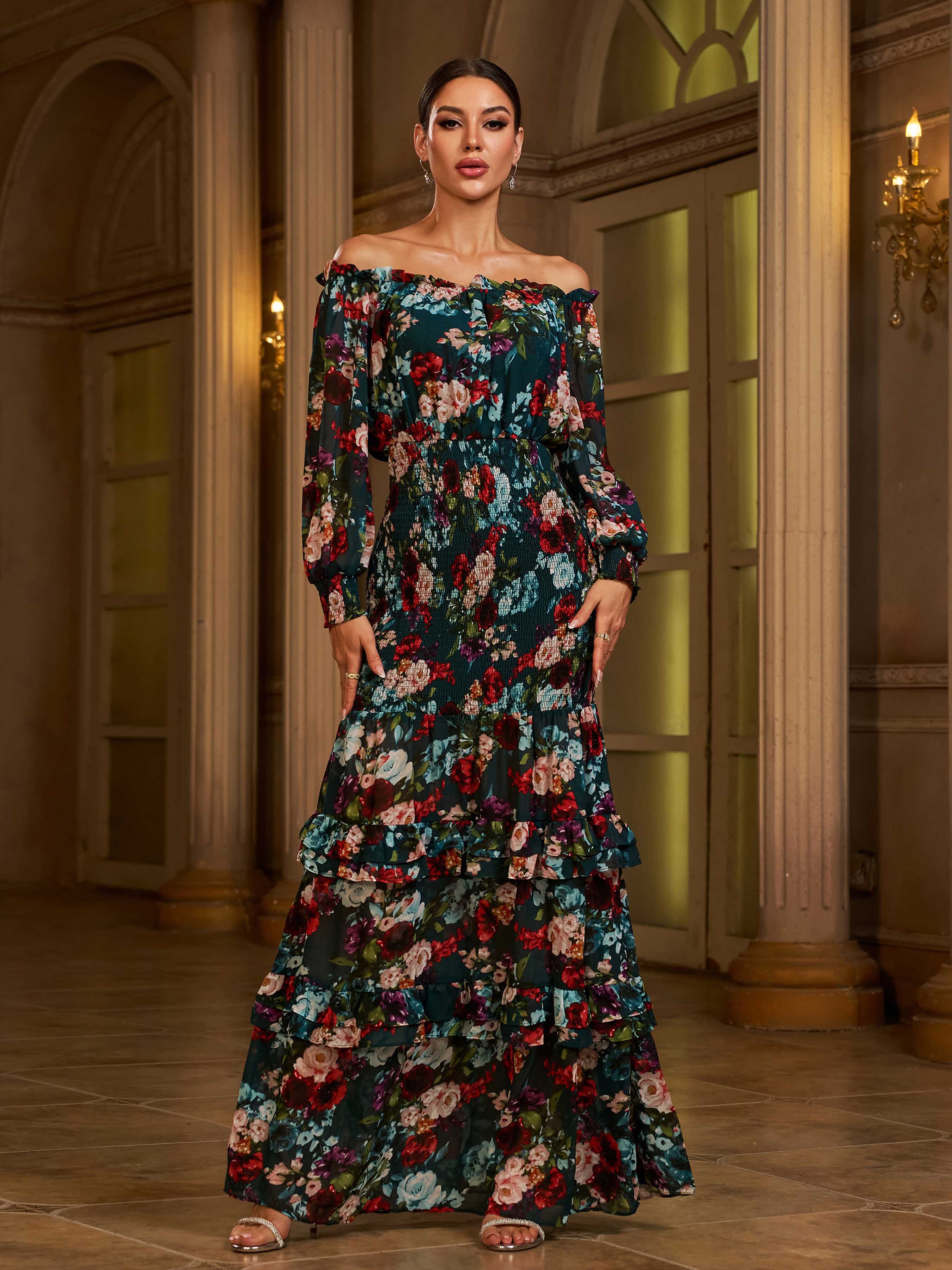 Long Sleeve Corset Cutout Floral Evening Dress DH80214