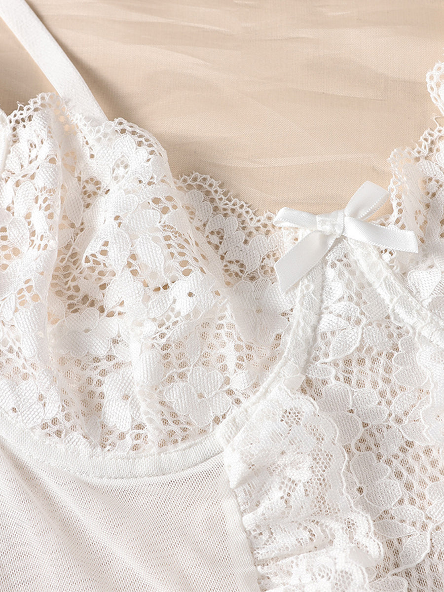 White Lace Bowknot Ruffled Teddy MSL072