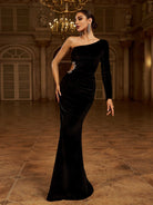 This Cut Out Asymmetrical Black Velvet Formal Dress features sleek long sleeves and an exquisite maxi length.