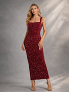 A refined silver sequin gown featuring a square neckline & slim-fitting midi silhouette for effortless elegance.Perfect for cocktail parties, evening galas, and formal weddings.