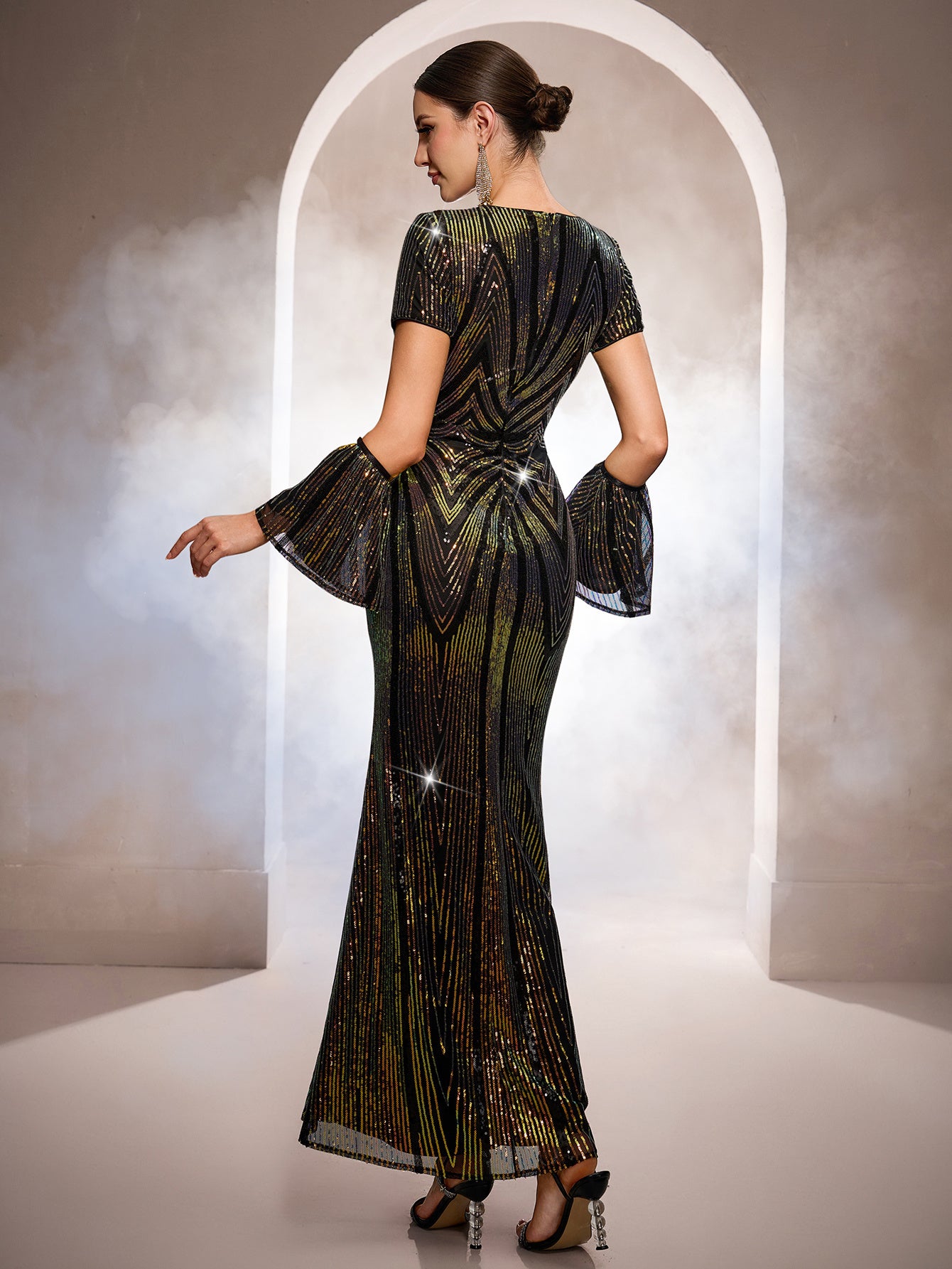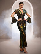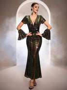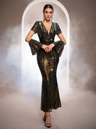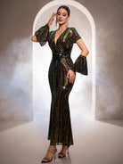 Designed for glamorous formal events, this black gown features iridescent sequin patterns with gold and green undertones, a deep V-neckline, dramatic flare sleeves, and a sleek mermaid silhouette for a bold, eye-catching look. Perfect for galas, red-carpet occasions, and upscale evening celebrations.