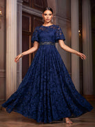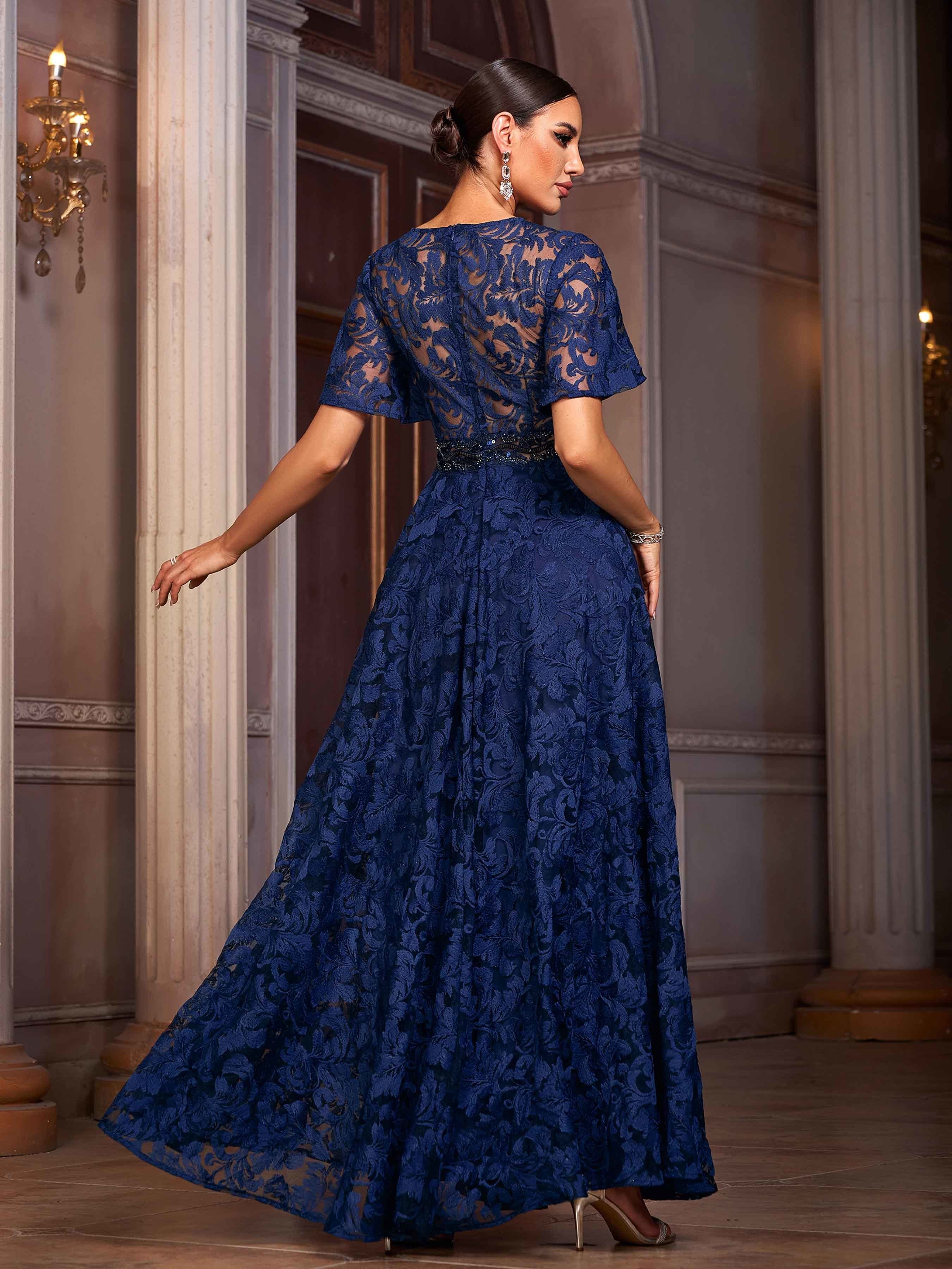 Timeless glamour meets luxe texture: this navy floral lace maxi features sheer lace short sleeves, a beaded cinched waist, and a lightweight flowy floor-length skirt. Ideal for weddings/galas—soft, flattering, and endlessly elegant.