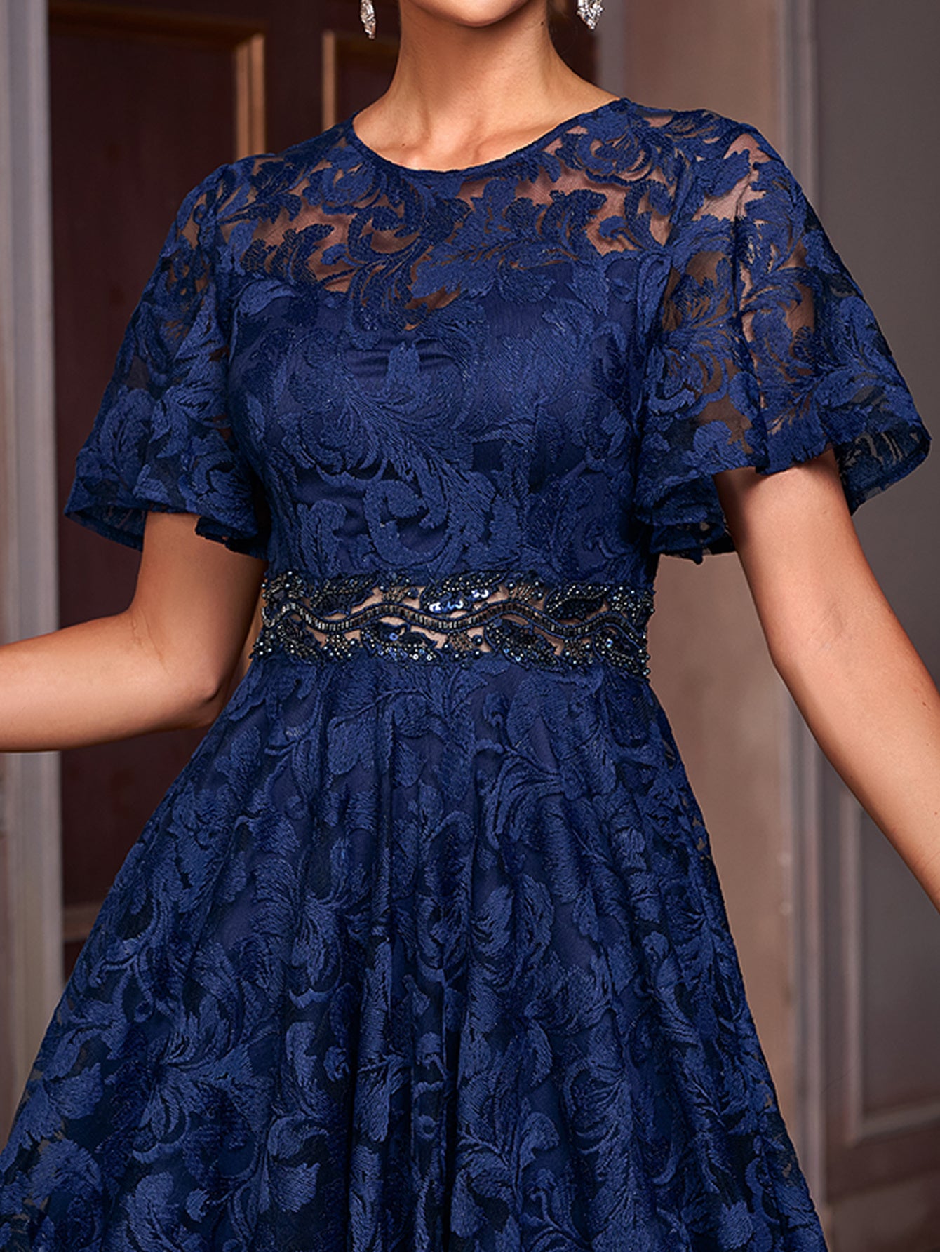 - Detail: Short Sleeve, Lace Embroidered, Sequin Embroidered Mesh Waist