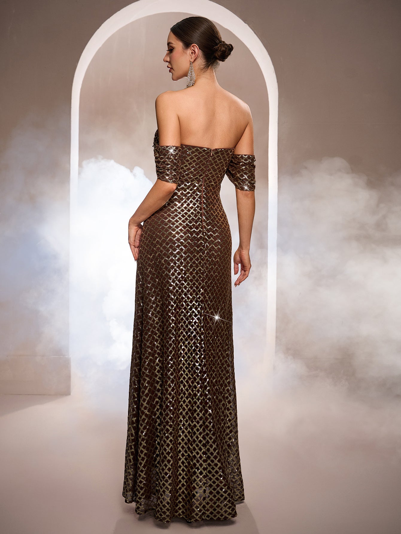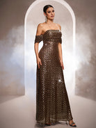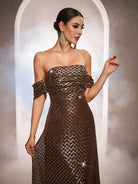 Designed for glamorous formal events, this brown gown features a gold grid sequin pattern, an off-shoulder neckline, and a sleek mermaid silhouette for a sophisticated, eye-catching look. Perfect for galas, red-carpet occasions, and upscale evening celebrations.