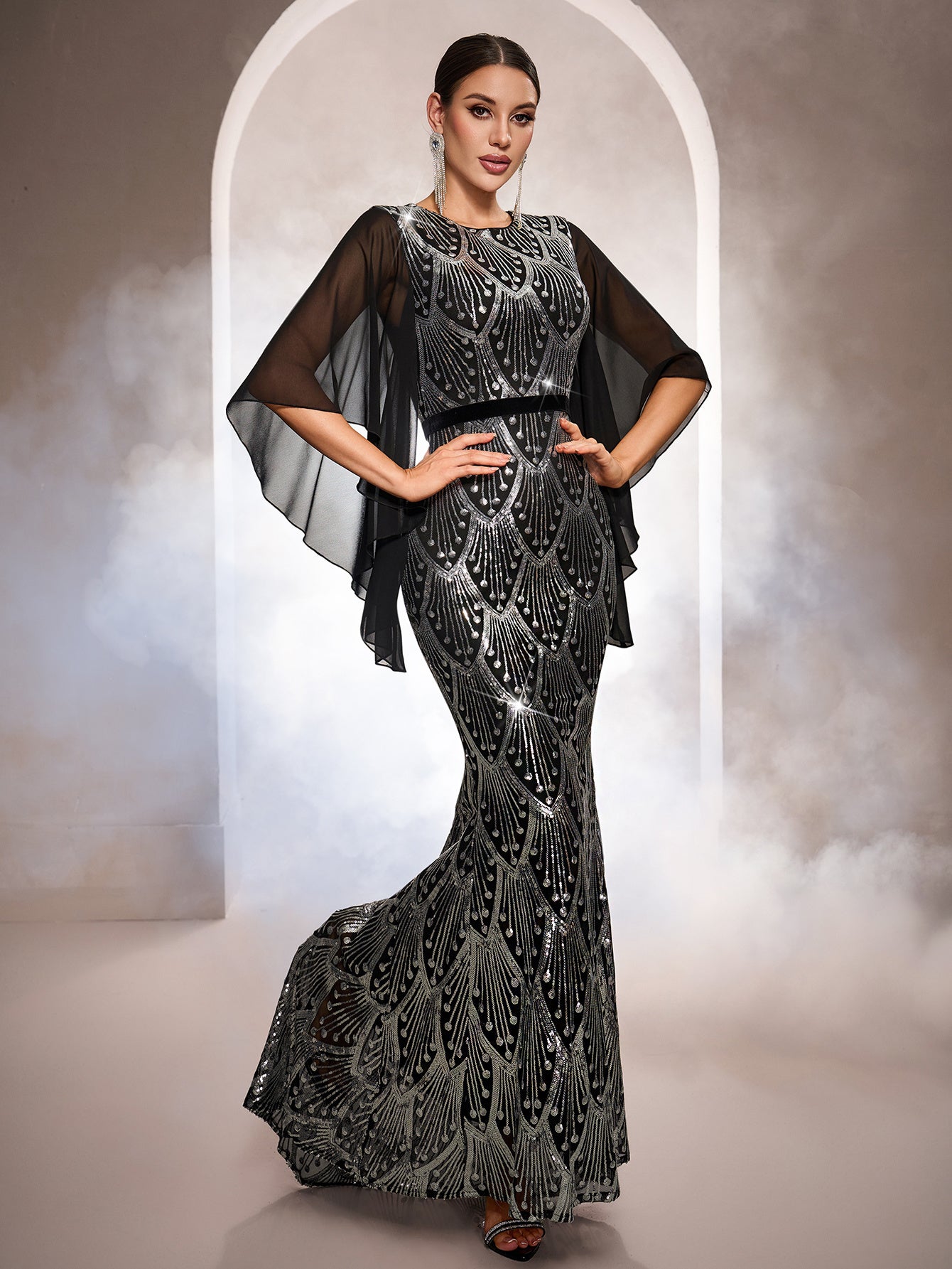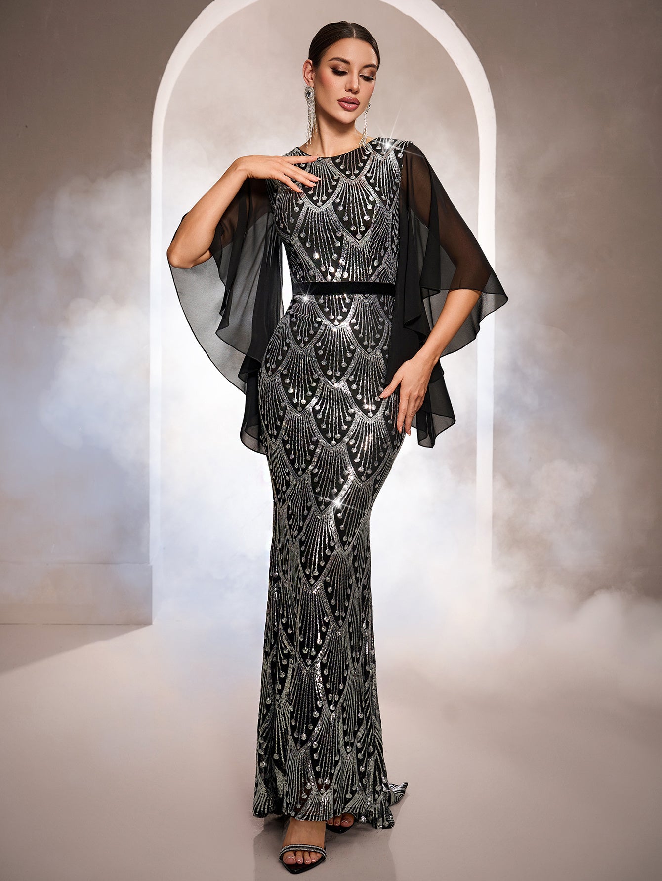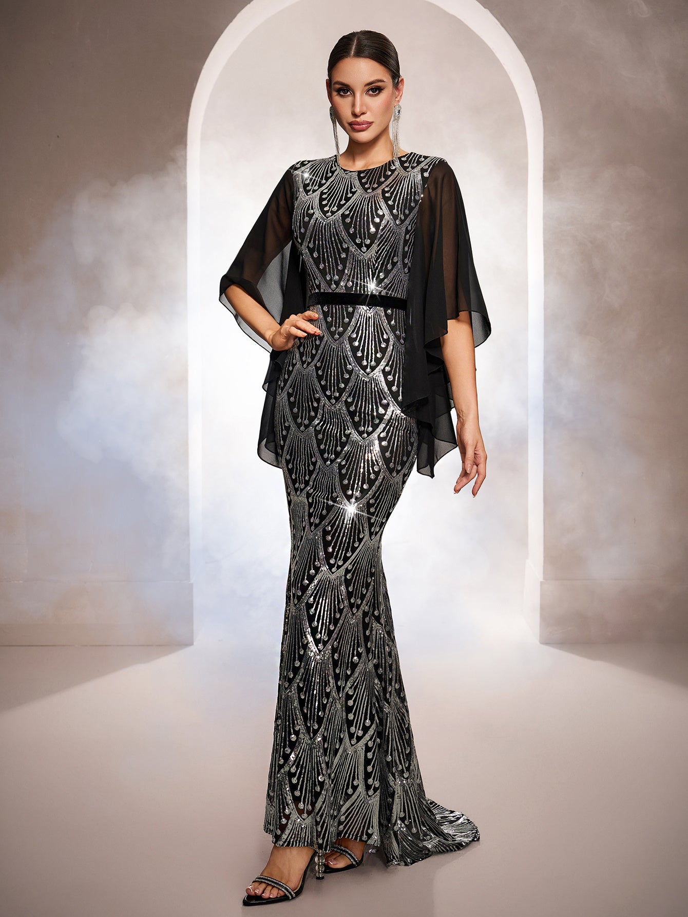 Flowy Cape Sleeves Geometric Sequin Formal Dress GM010195