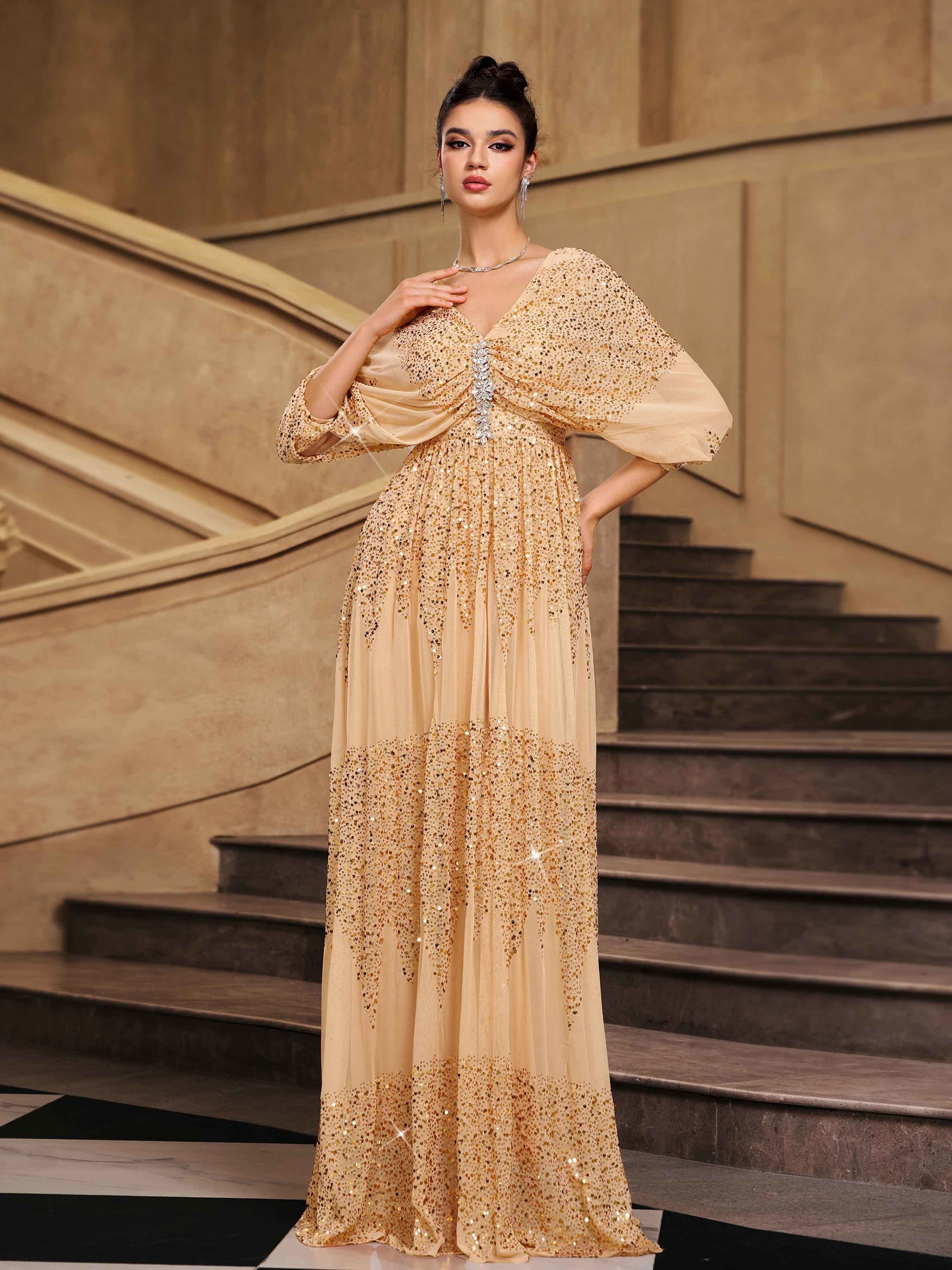 Flared Bell Sleeve Mesh Embellished Formal Dress DH80471