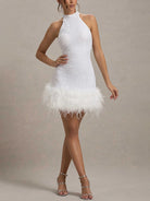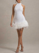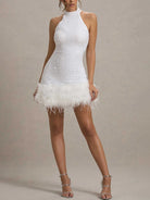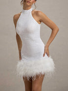 Dazzle the dance floor in this show-stopping sleeveless mini dress! Shimmering sequins catch every light while luxe feather accents add movement and drama. The fitted silhouette flatters your curves, while the playful mini length keeps things fun and flirty. Perfect for parties, nights out, or whenever you want to turn heads and feel absolutely fabulous. Slip it on and prepare for compliments all night long!