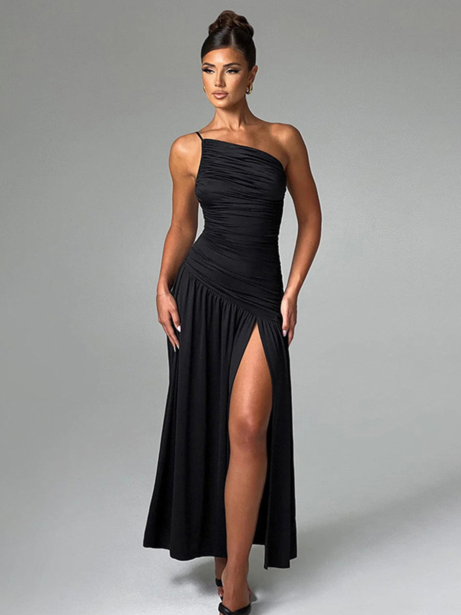 Ruffled One Shoulder Split Ruched Wedding Guest Dress XF05710