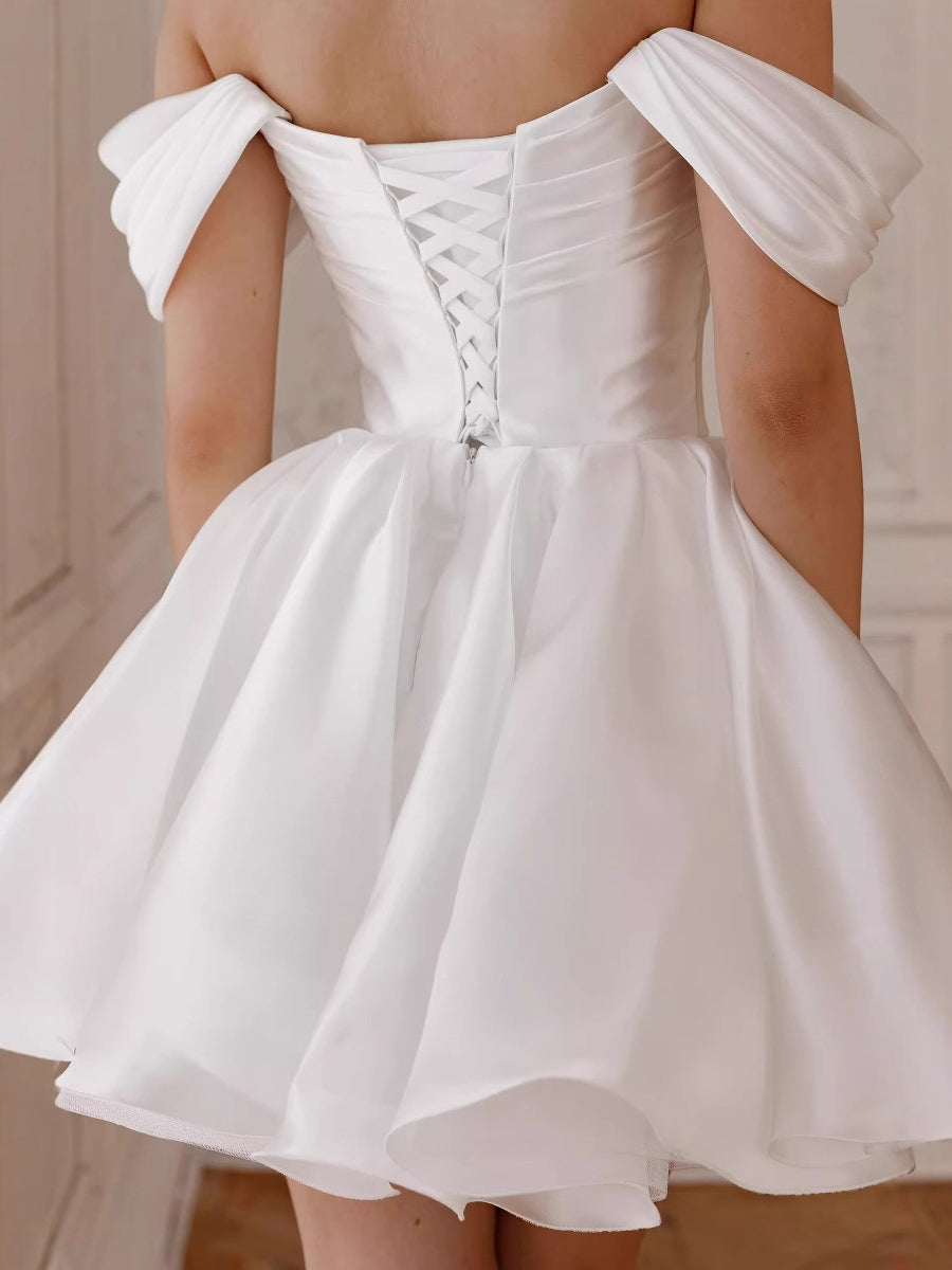 Ruched Skater Off-Shoulder Draped Satin Mini Wedding Dress MSW076