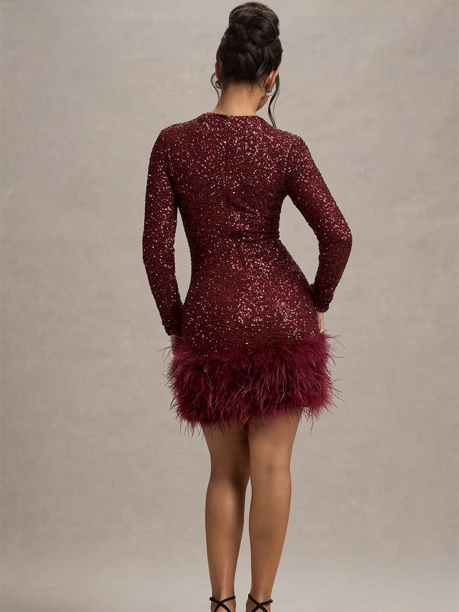 Long Sleeve Sequin Feather Mini Dress XF251193