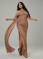 Wow the crowd at prom in this playful off shoulder dress. The draped sequin fabric adds a touch of sparkle to the unique light brown color. Plus size available for a comfortable fit. Get ready to dance the night away in style!