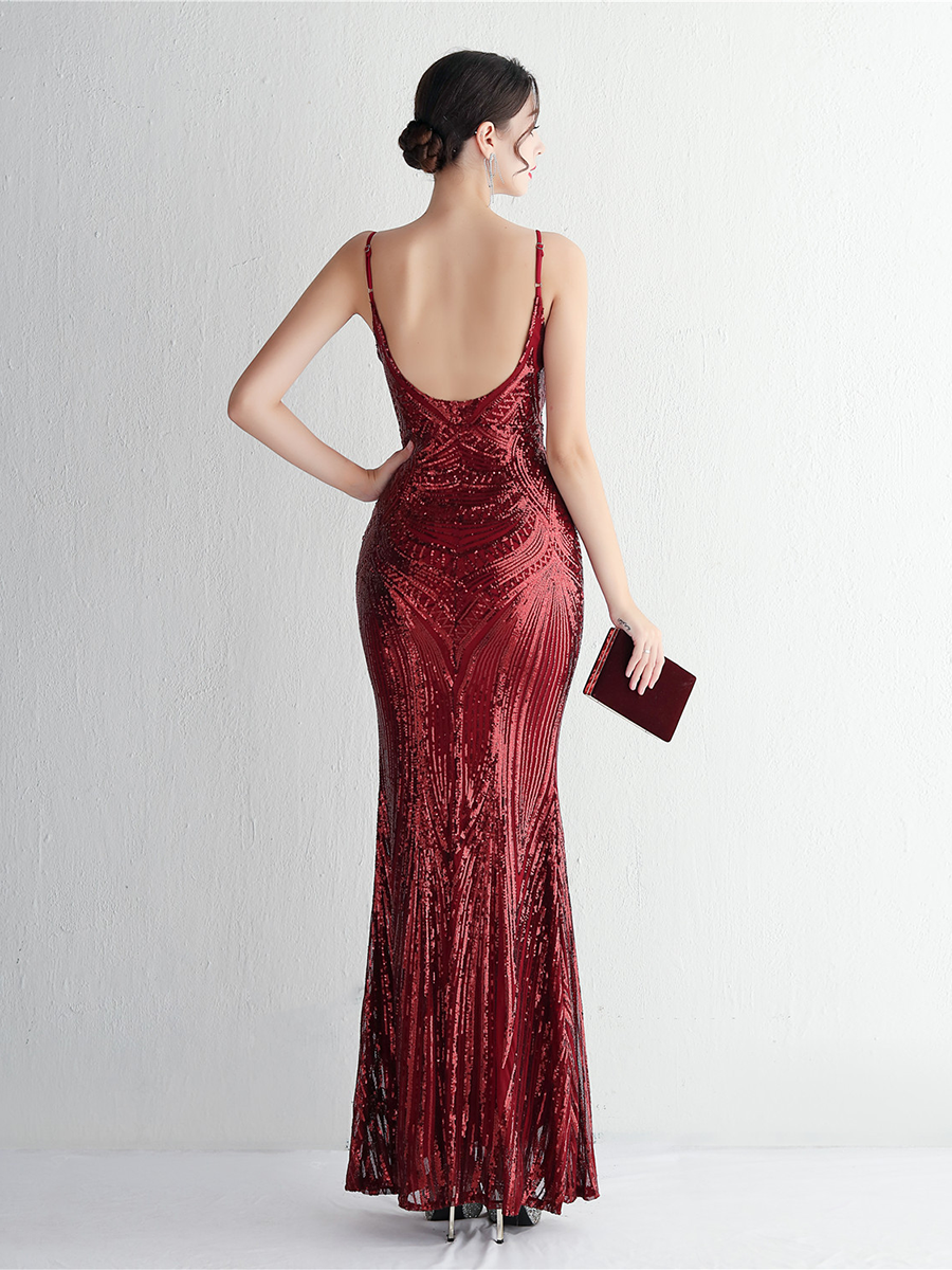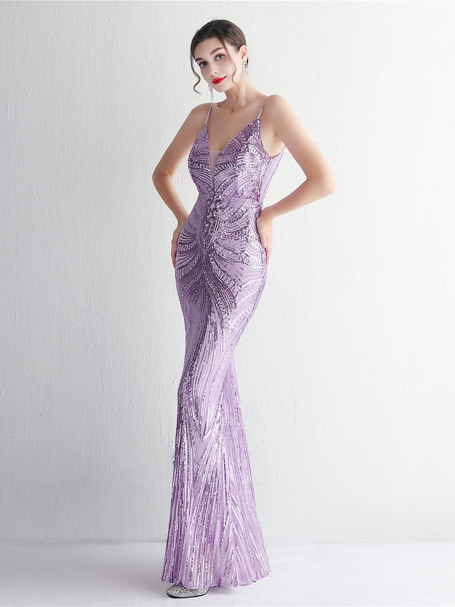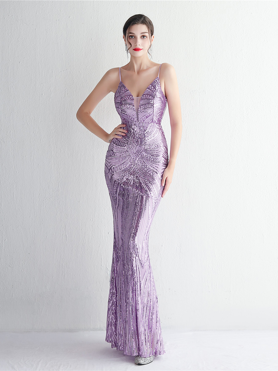 Formal Deep V Neck Spaghetti Sequin Evening Gown M02188