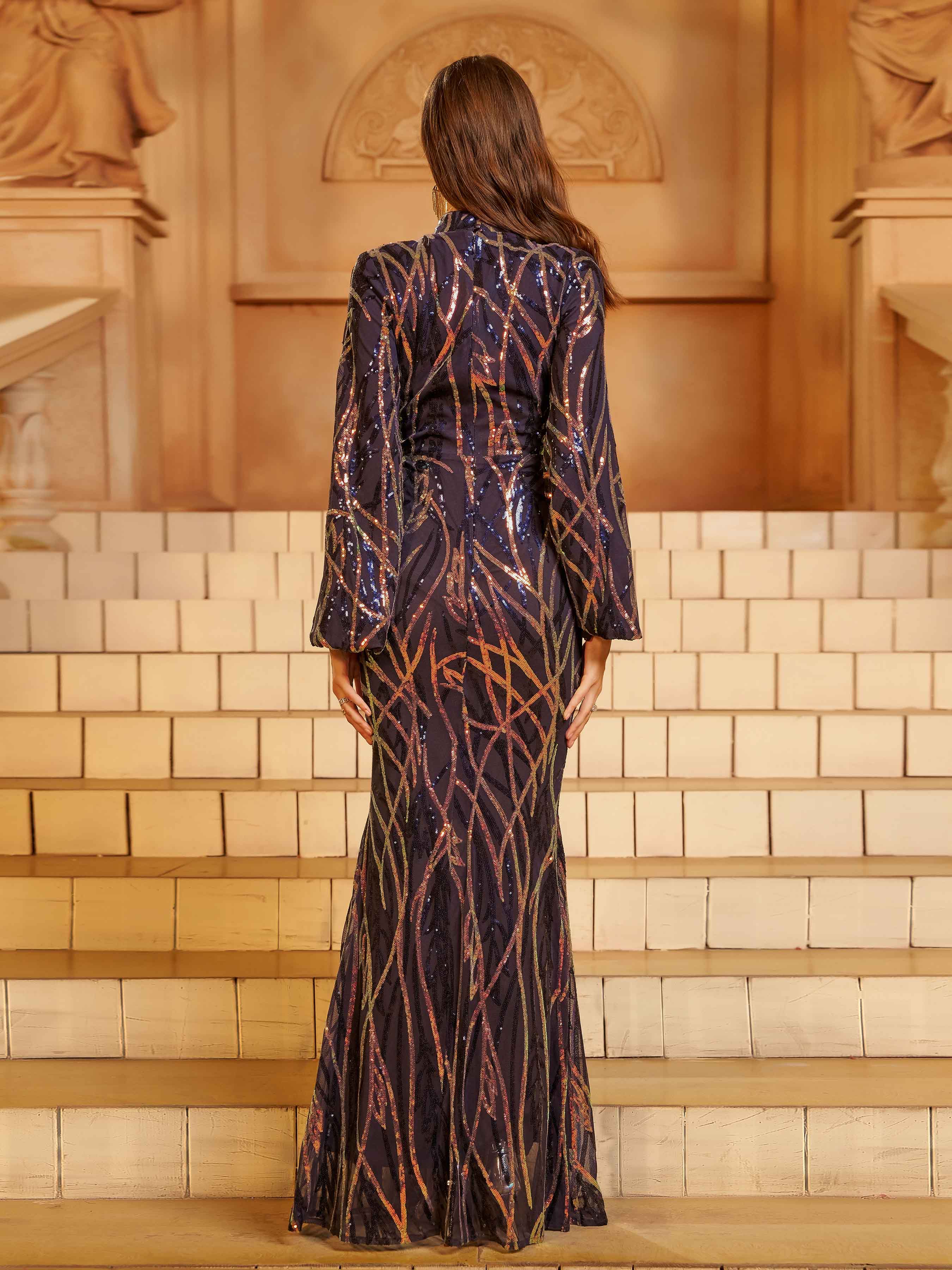 Long Sleeve Blue Maxi Sequin Formal Dress XJ1554