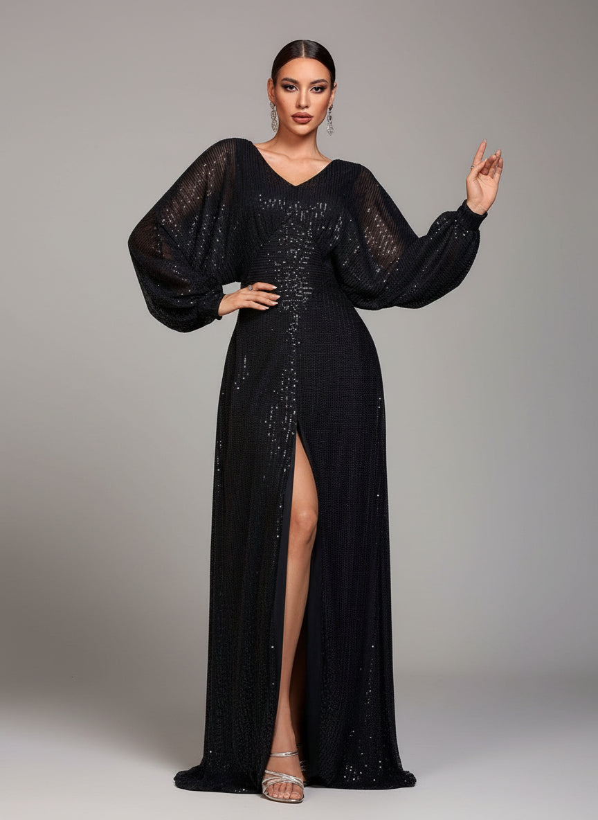 Black Solid Sequin Slit Long Sleeve Elegant Prom Dress RJ11099