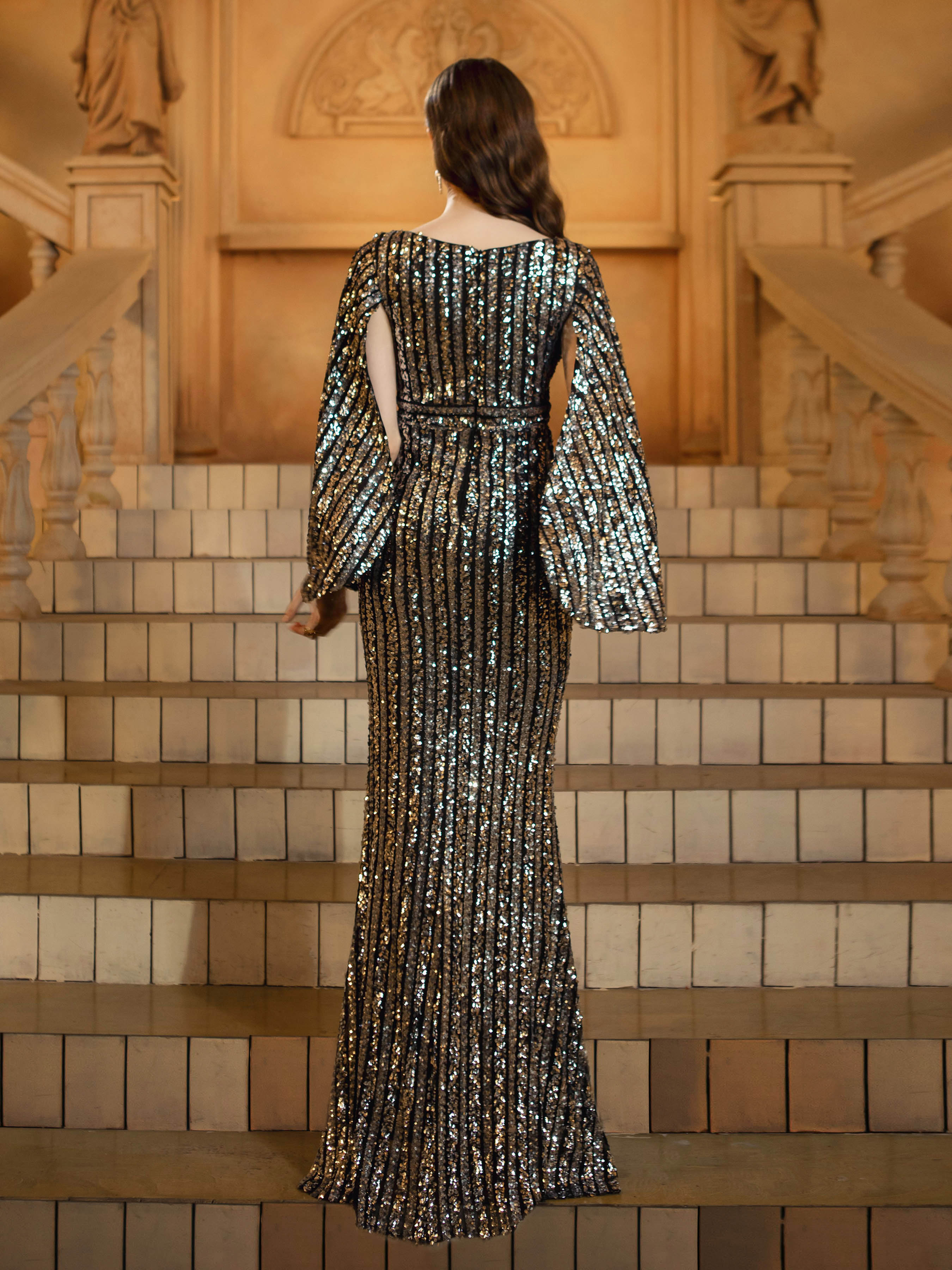 Black Geometric Sequin Bell Sleeve Evening Dress GM010124