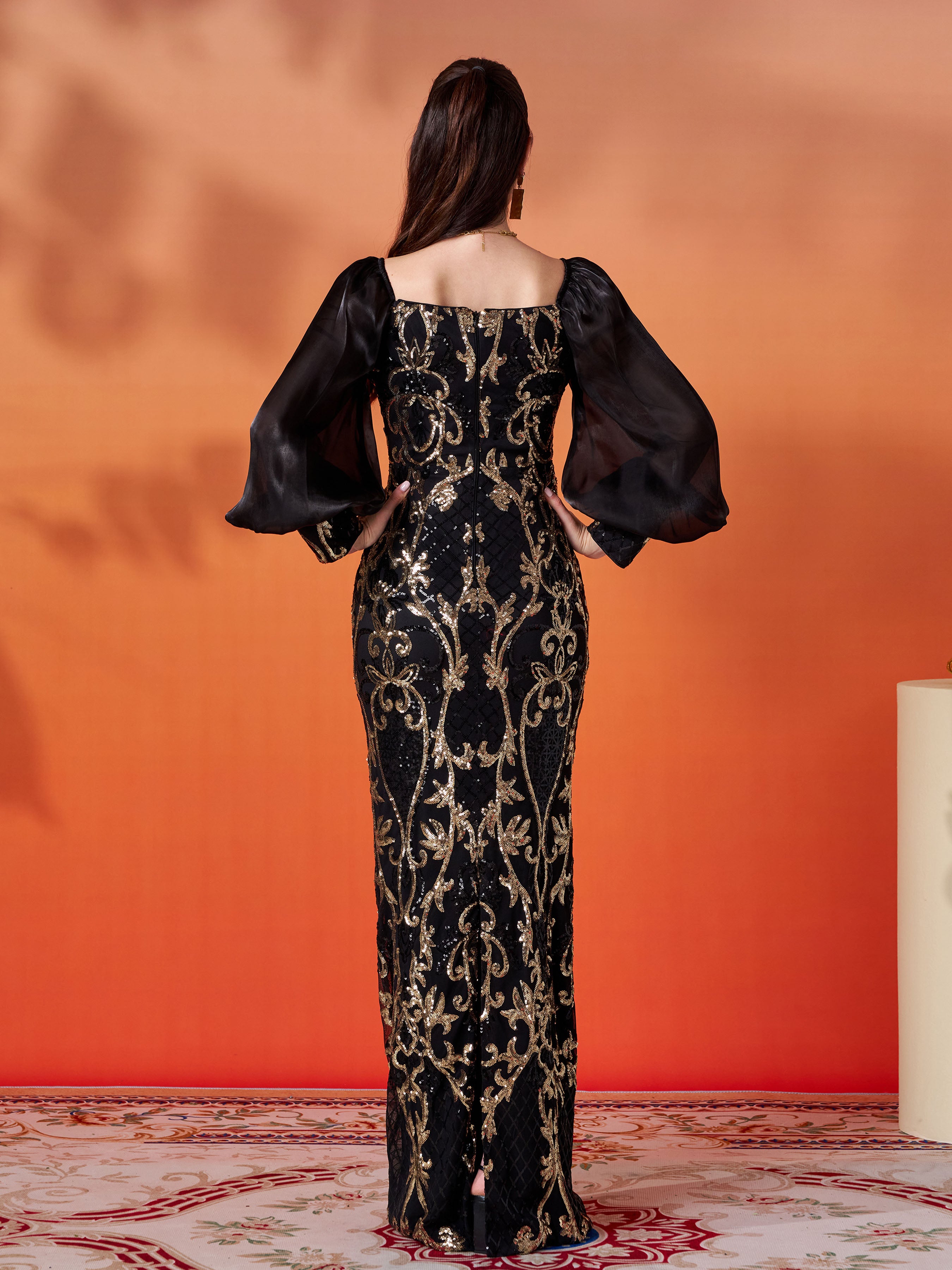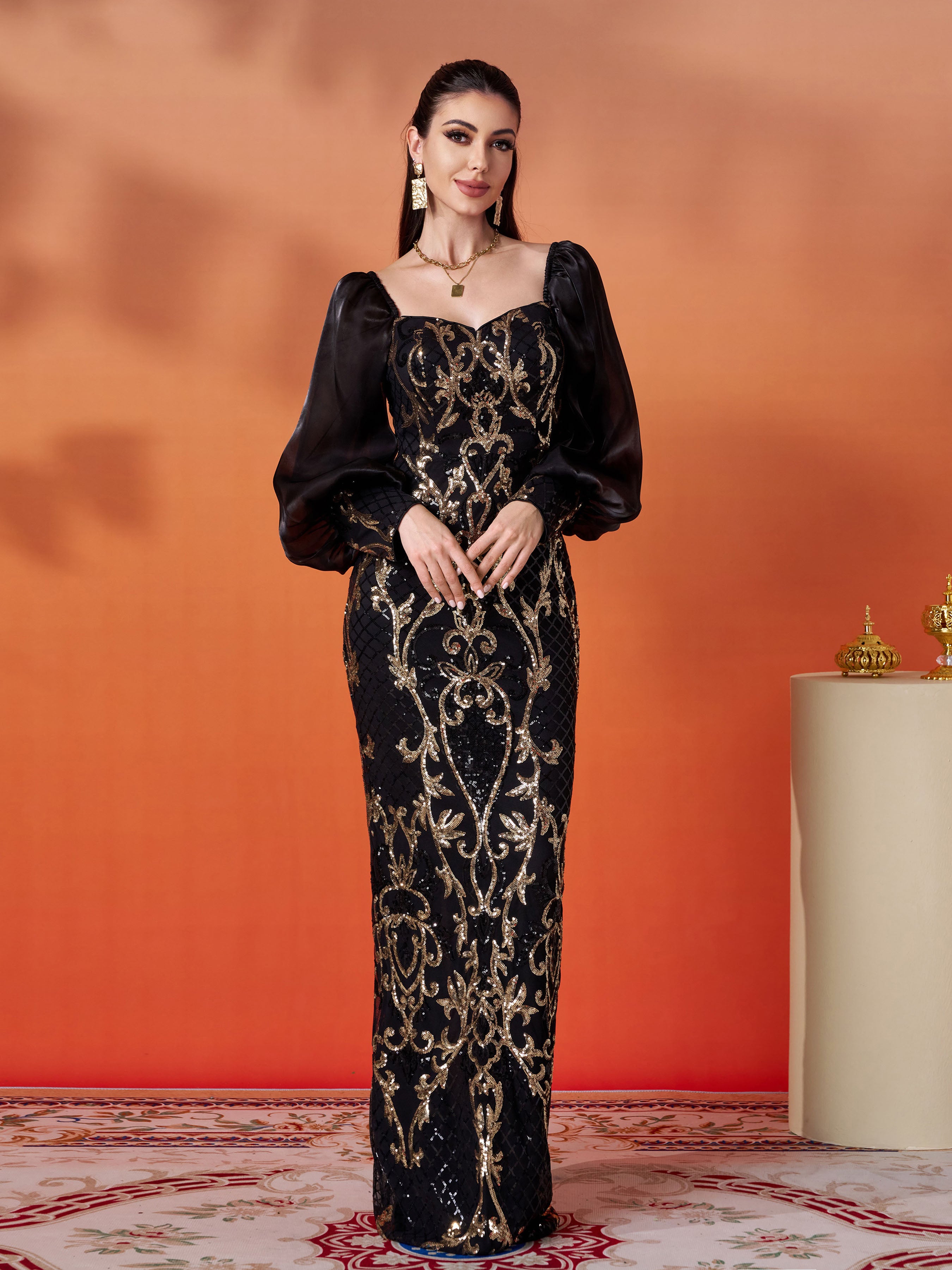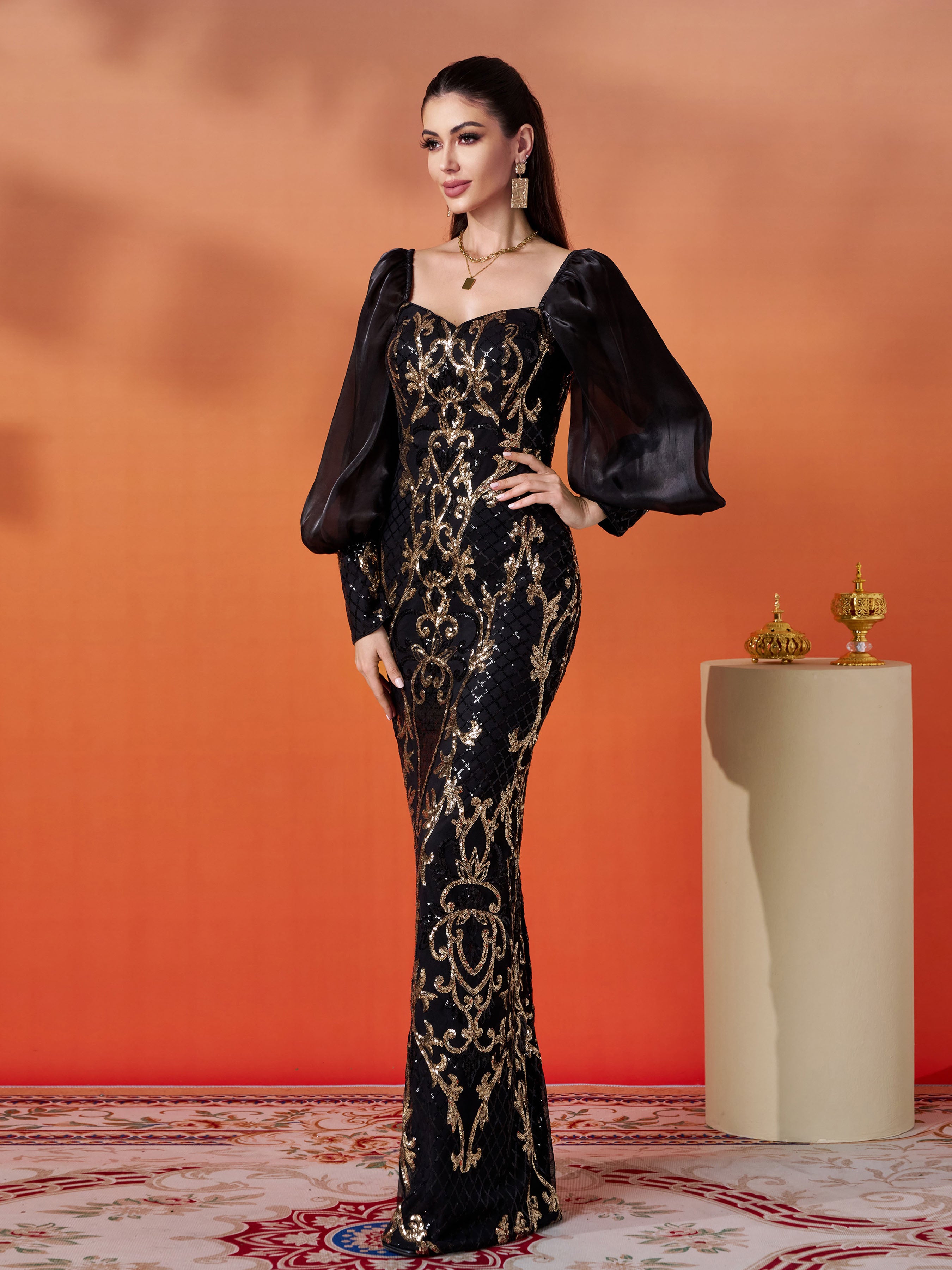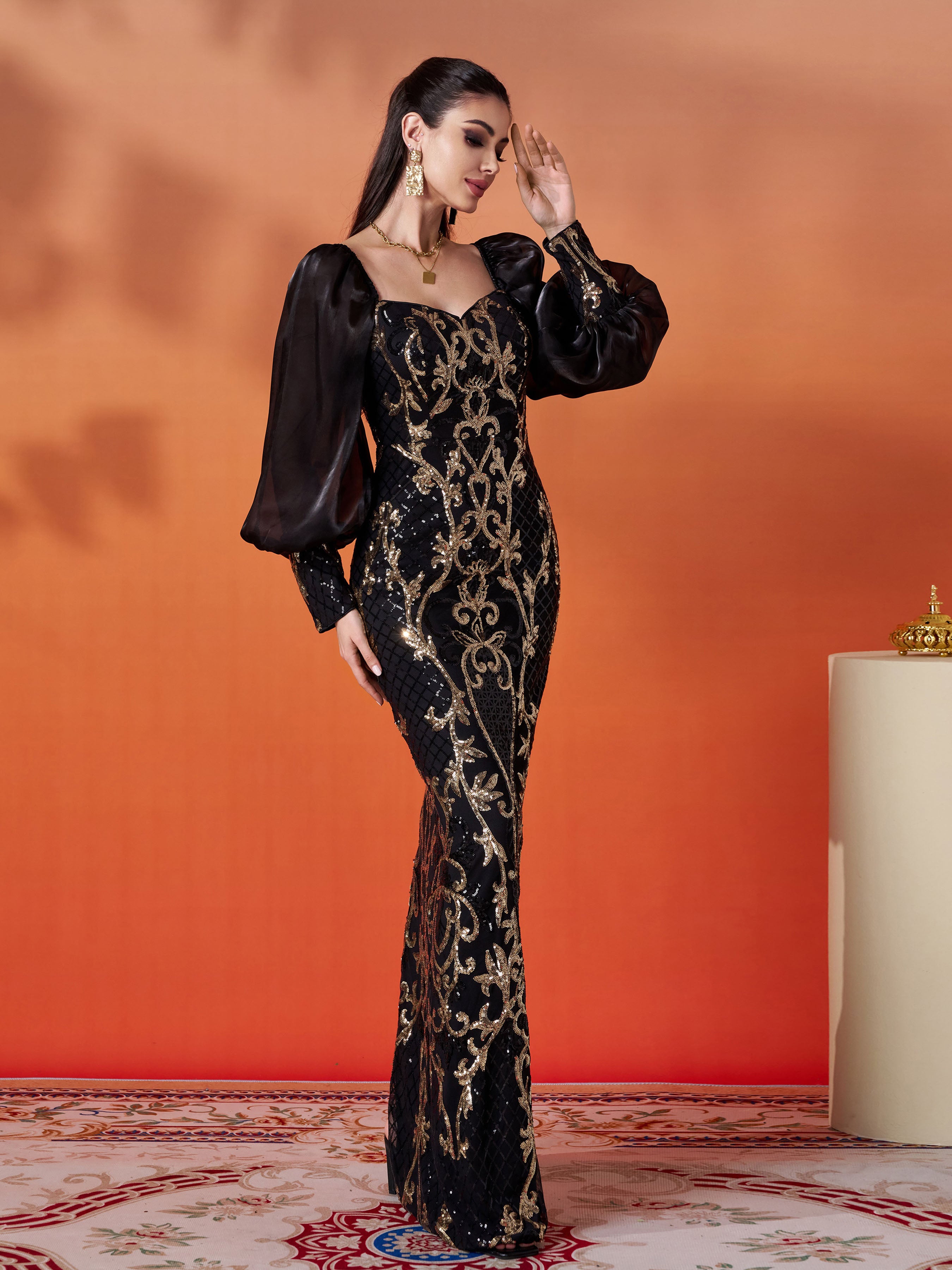 Plus Black Full-Sequin Long-Sleeve Formal Dress PXF25138