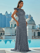 This One Shoulder Mermaid Hem Sequin Formal Dress showcases a ruffled, ruched silhouette with a single shoulder strap and a sleeveless cut adorned with shimmering sequins.