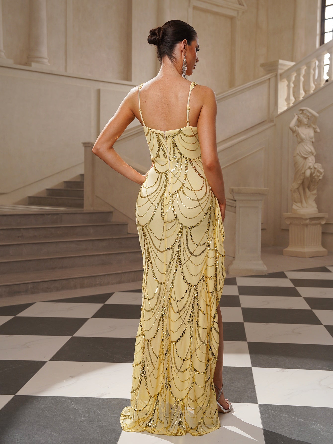 Shimmer into the spotlight in this stunning yellow sequin cocktail dress that's pure party magic. The ripple sequin detailing catches every light, while the daring split adds a flirty edge to your silhouette. Perfect for nights when you want to turn heads and feel absolutely fabulous. Whether it's cocktails with friends or a special celebration, this dress delivers glamour with a playful wink. Slip it on and let your confidence shine as bright as those sequins.